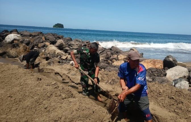 ABDYA – Babinsa Koramil 04/Susoh Kodim 0110/Abdya, Serda Abdul Kadir, bersama warga Desa Ujung Serangga, Kecamatan Susoh, menggelar aksi gotong
