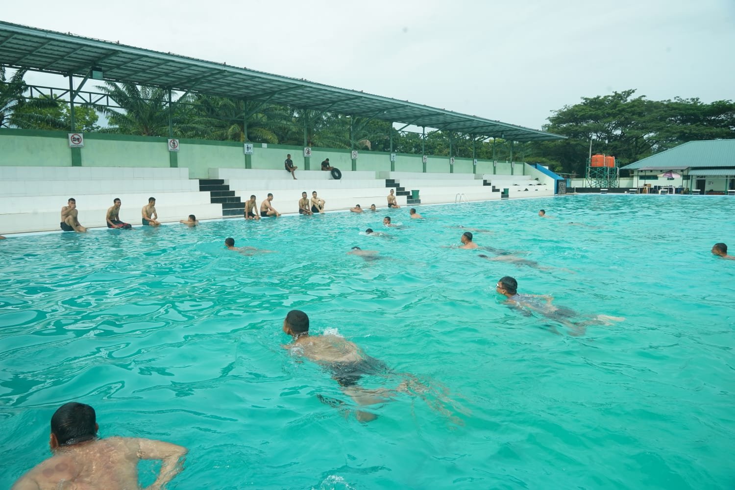 Meulaboh – Dalam rangka meningkatkan kemampuan dan ketangkasan prajurit, Korem 012/Teuku Umar melaksanakan latihan renang dasar di Kolam Renang Yonif