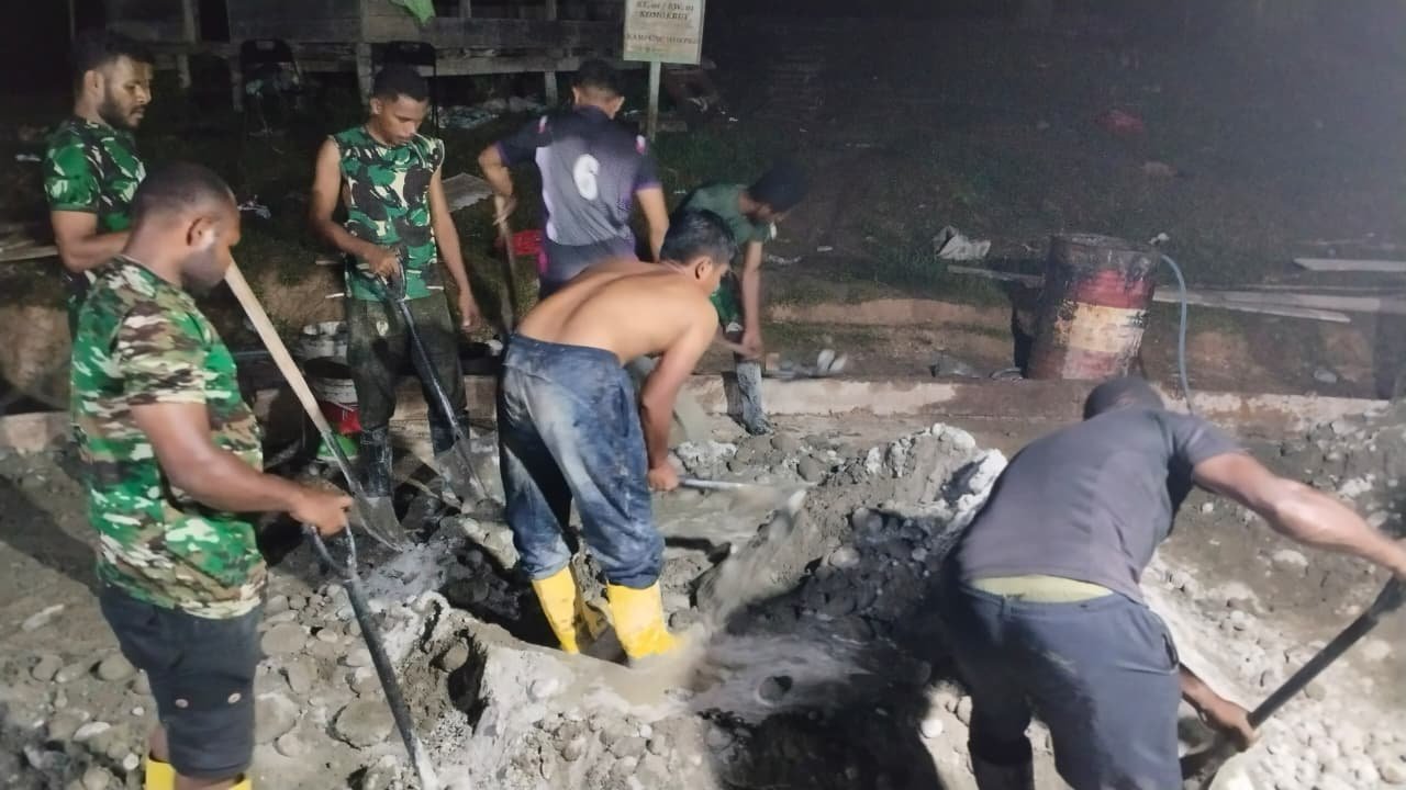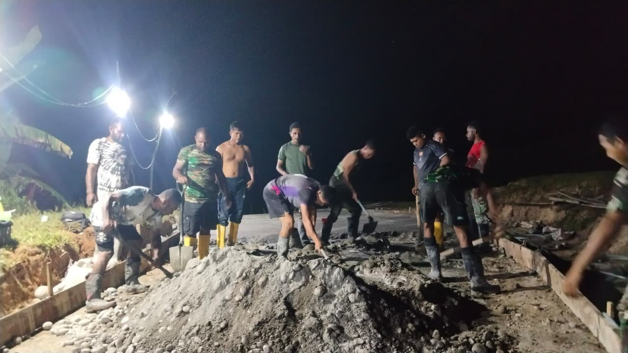 Tak Kenal Waktu, Satgas TMMD Ke-126 Lanjutkan Pengecoran Jalan Hingga Larut Malam di Waropko