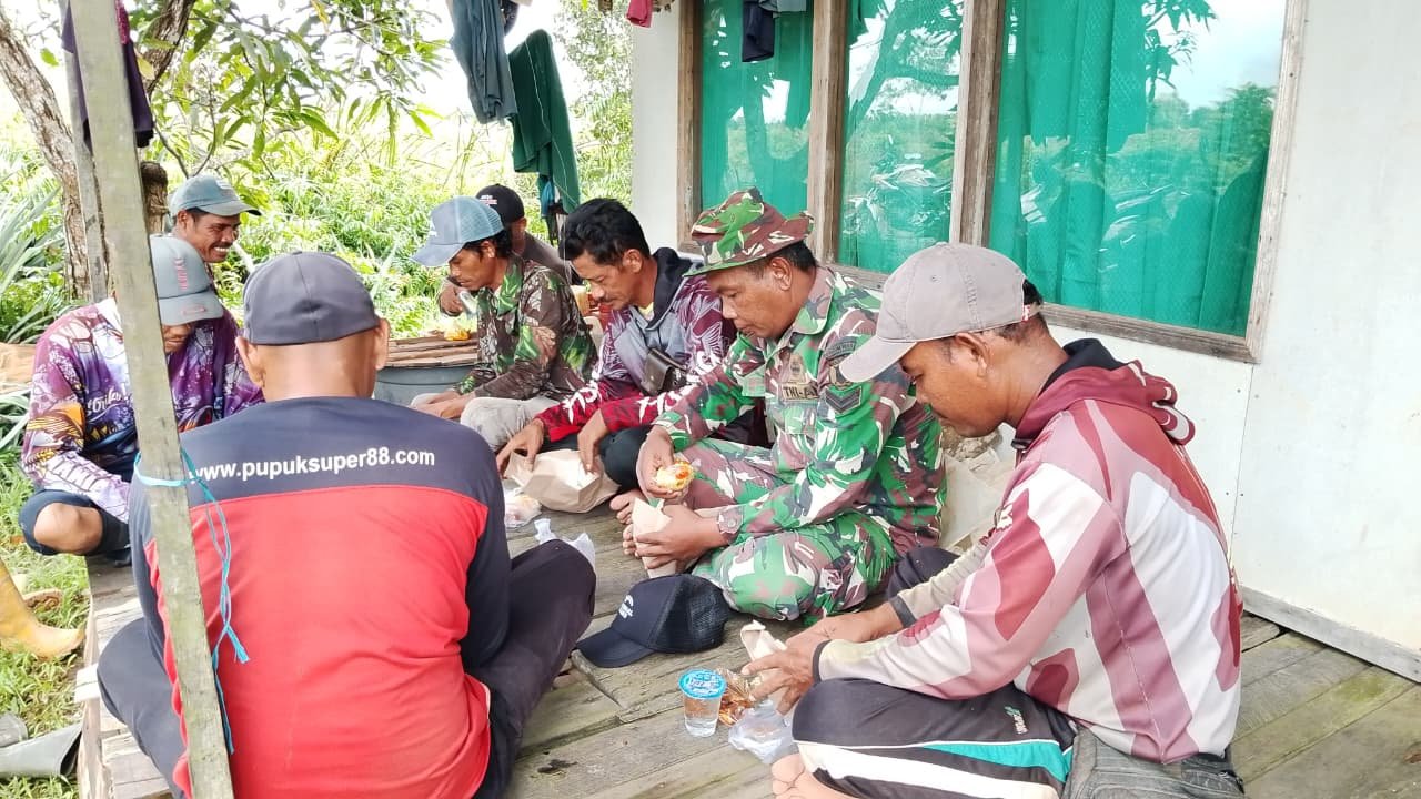 BARITO KUALA – Suasana kebersamaan terlihat di lokasi pelaksanaan TMMD Ke-126 Kodim 1005/Barito Kuala di Desa Tumih, Kecamatan Wanaraya. Saat