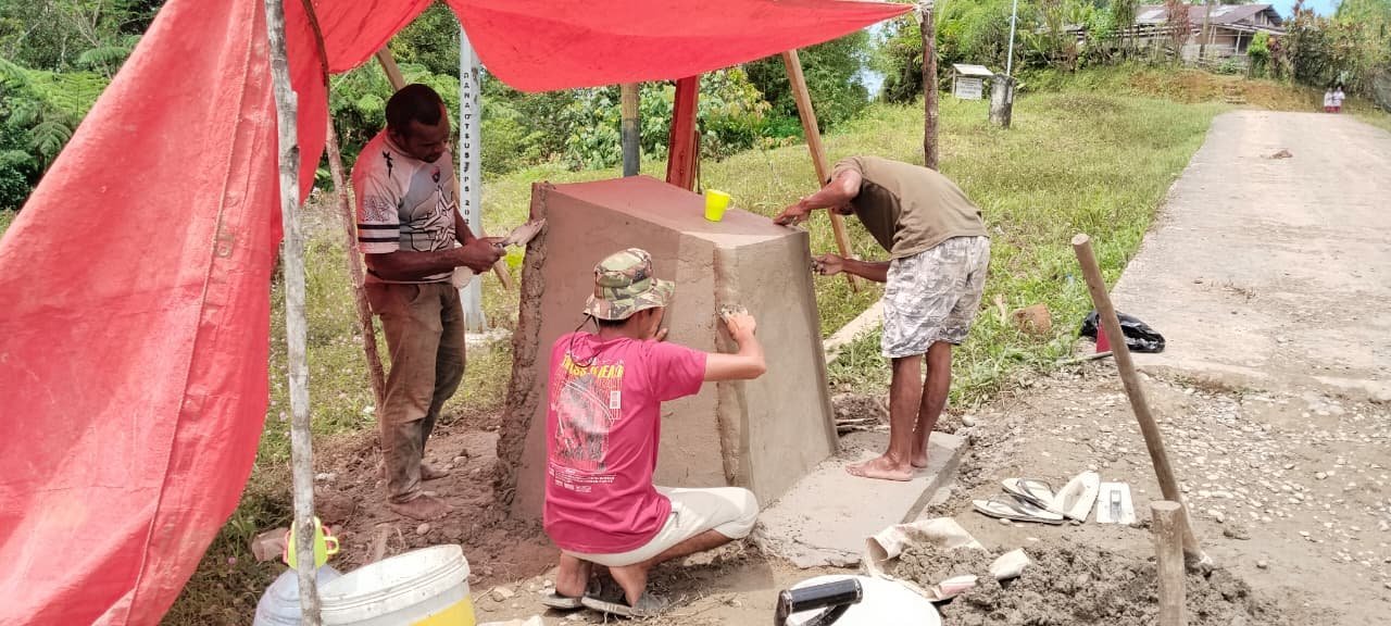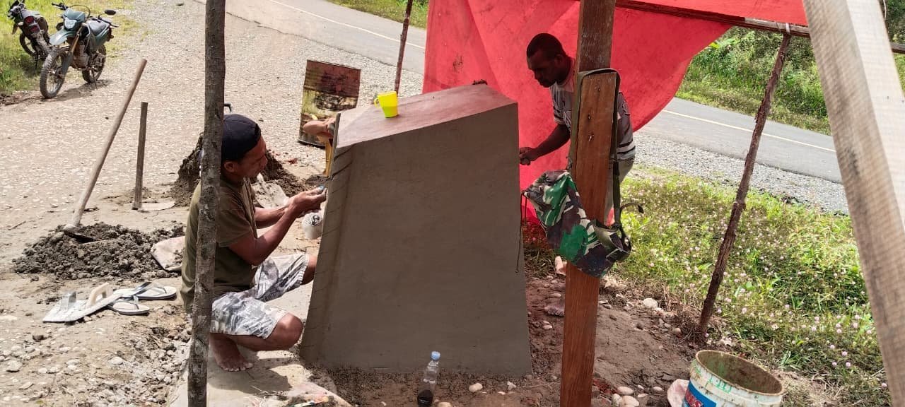 Boven Digoel, Papua Selatan — Pembangunan Tugu Prasasti TMMD ke-126 Kodim 1711/BVD di Kampung Waropko kini memasuki tahap akhir dan