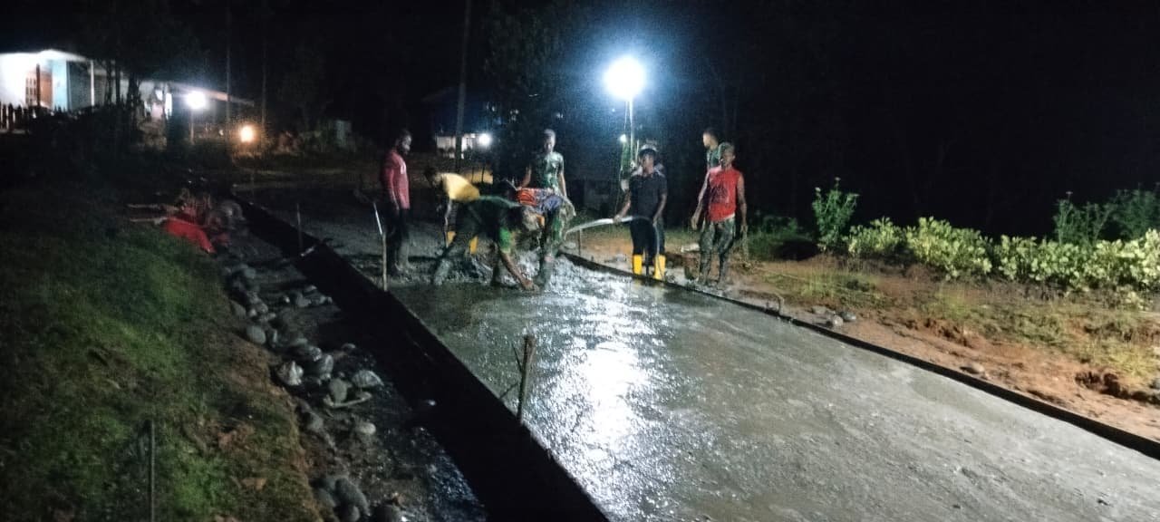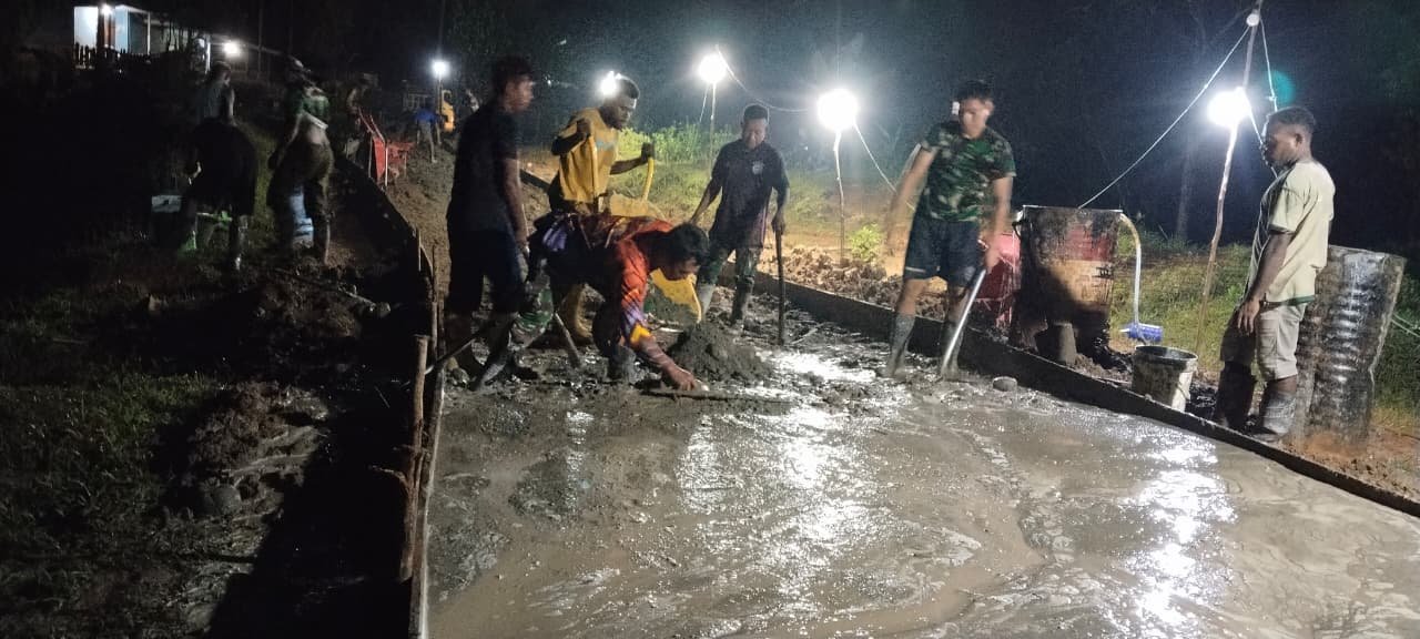 Boven Digoel – Malam tak menyurutkan semangat personel Satgas TMMD ke-126 Kodim 1711/BVD untuk menuntaskan pekerjaan fisik di Kampung Waropko.
