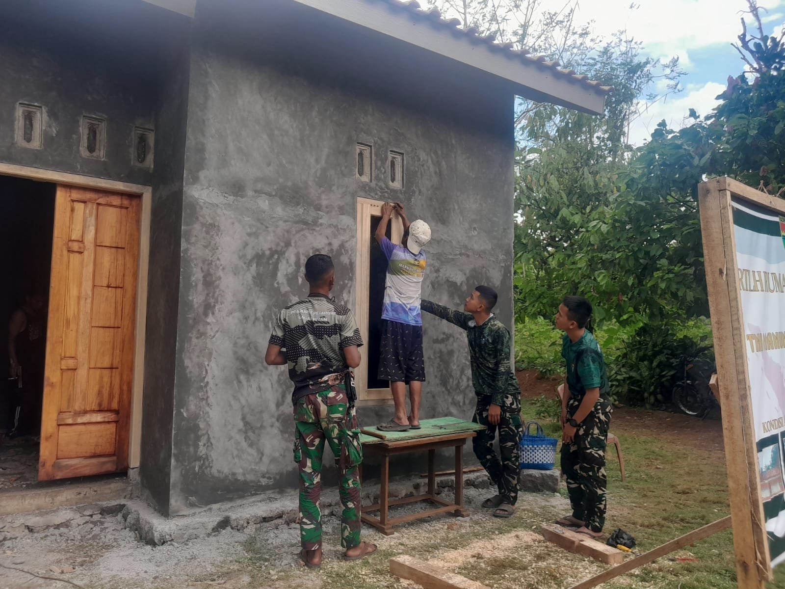 TNI dan Warga Desa Riung Gotong Royong Rehabilitasi Rumah Tidak Layak Huni dalam TMMD ke-126