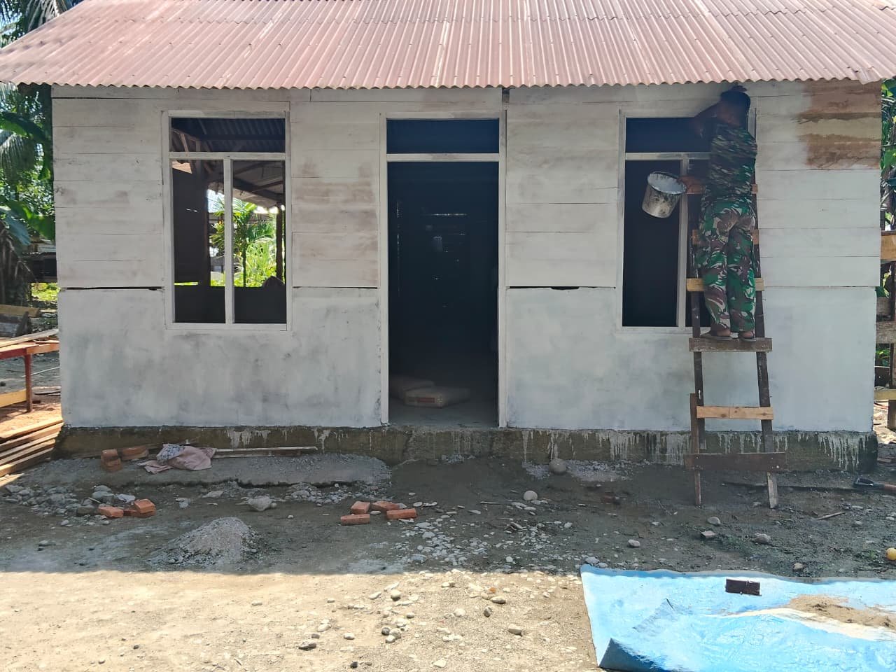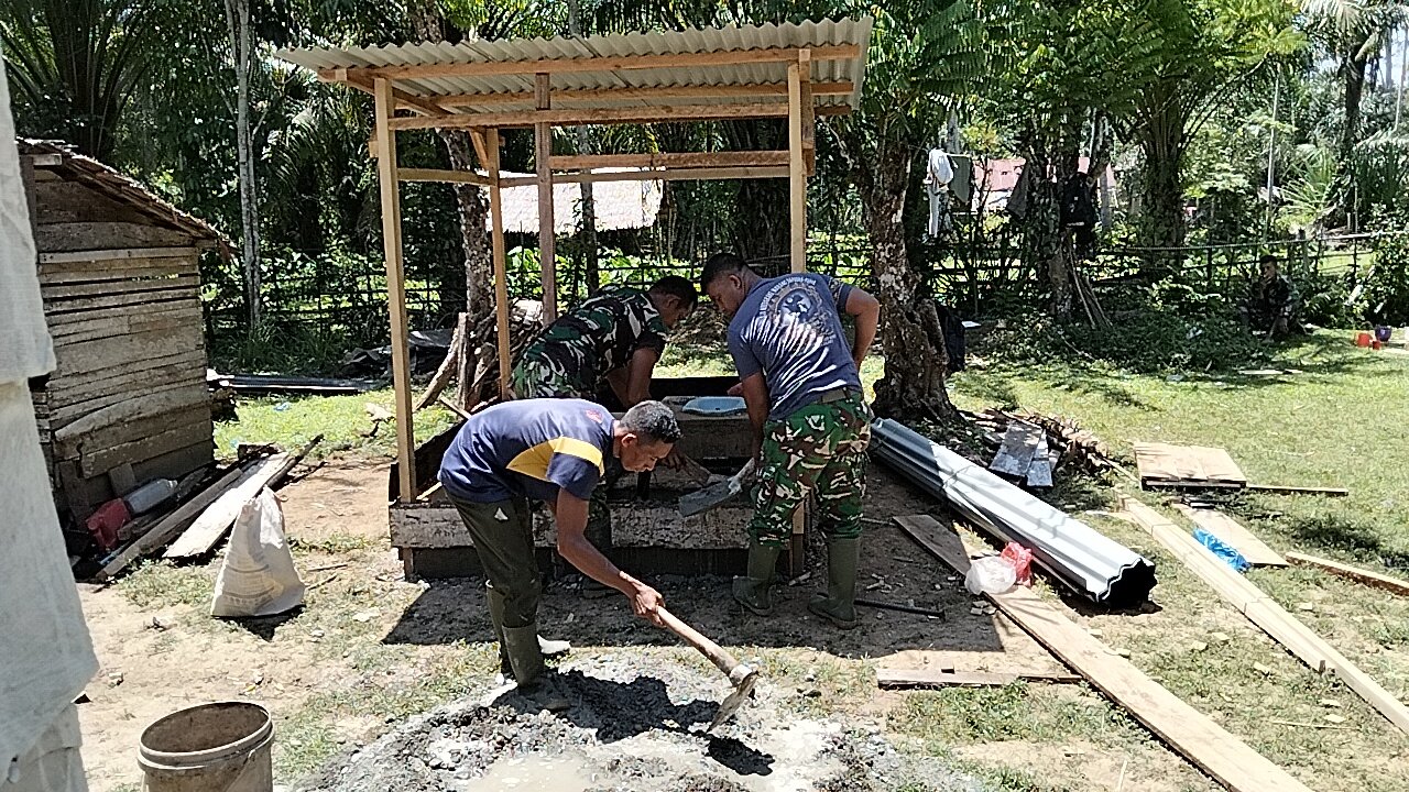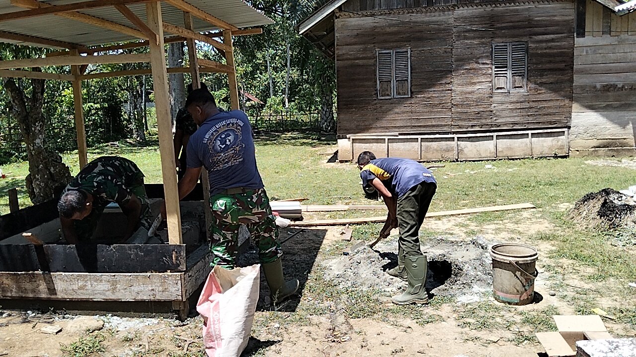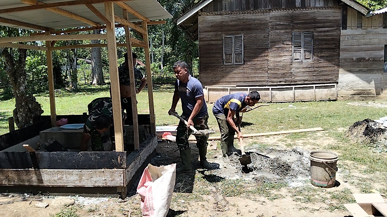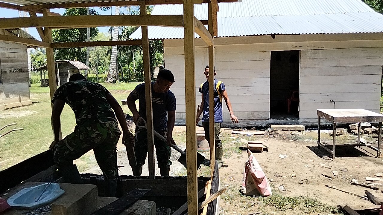Aceh Barat – Senin (9/3/2026) pagi di Desa Pasi Aceh terasa berbeda. Beberapa personel TNI terlihat sibuk menyiapkan material bangunan.