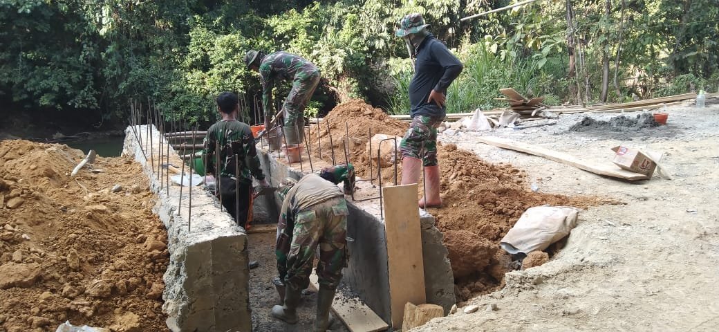 Waropko, Boven Digoel — Suasana kerja penuh semangat tampak di lokasi pembangunan MCK program TMMD Ke-126 Kodim 1711/BVD di Kampung