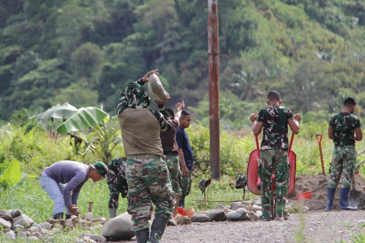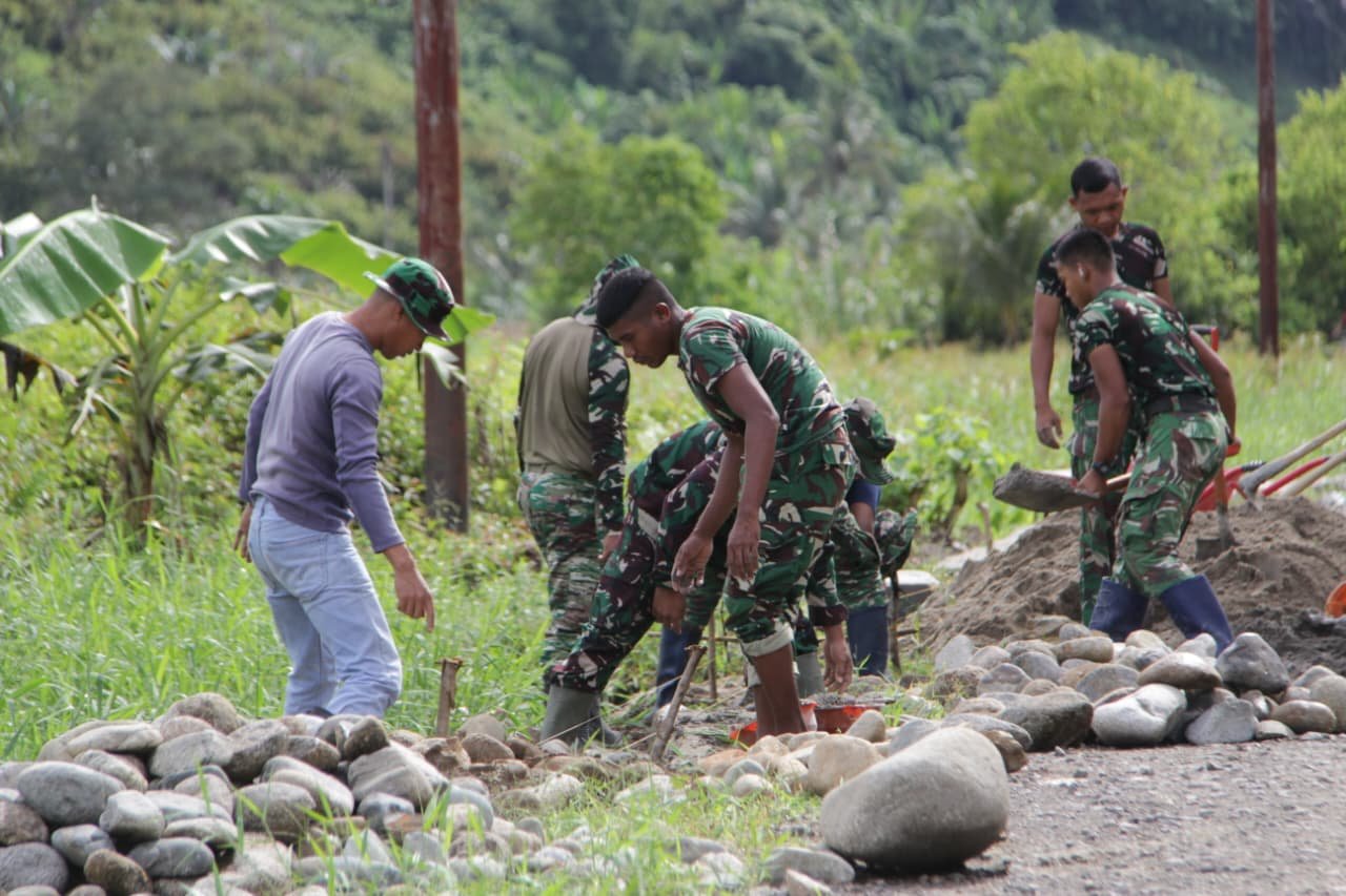 Tolitoli – Satgas TMMD ke-127 dari Kodim 1305/Buol Tolitoli sedang mengerjakan pengerasan jalan sepanjang 650 meter dan lebar 4 meter