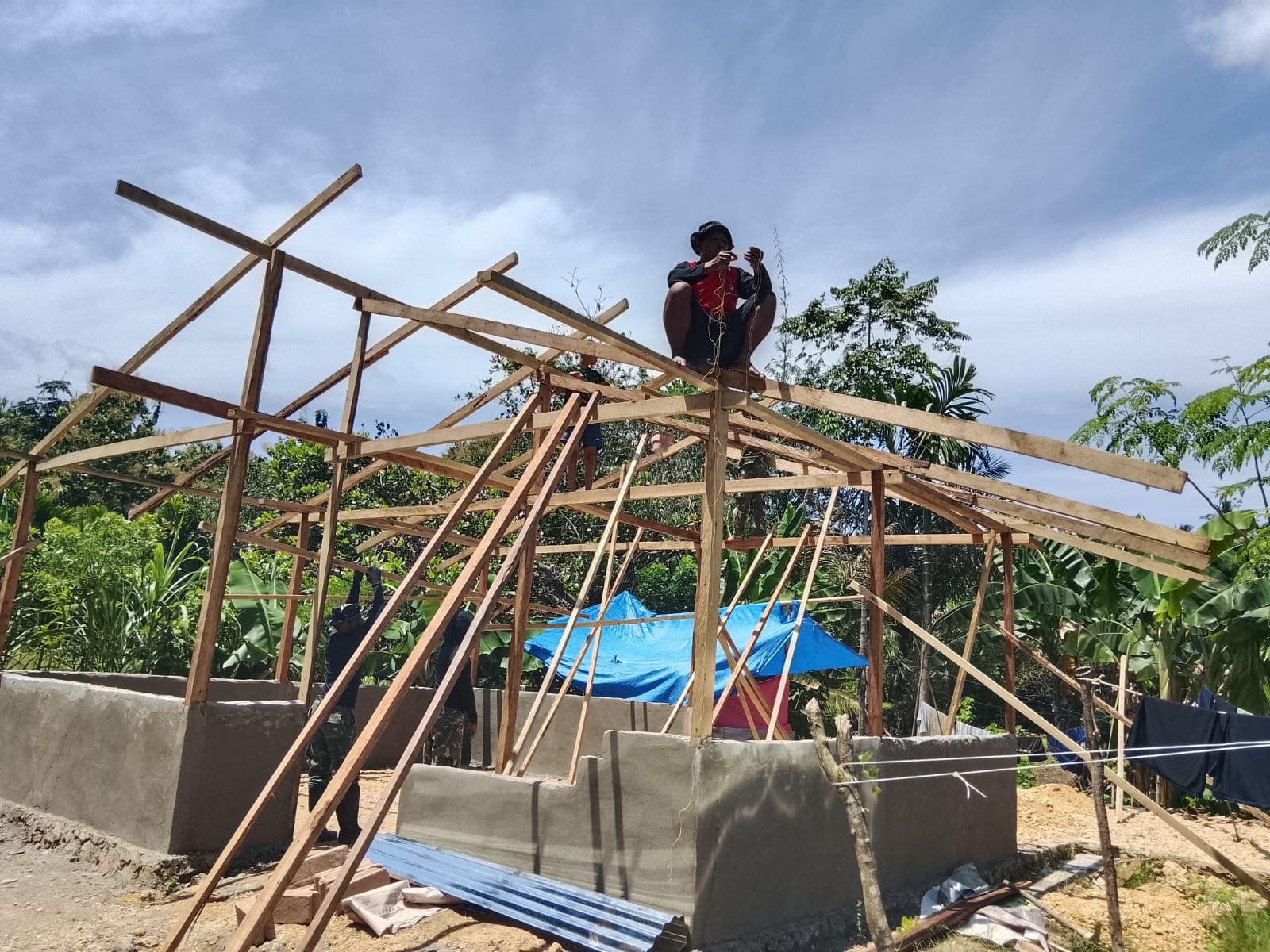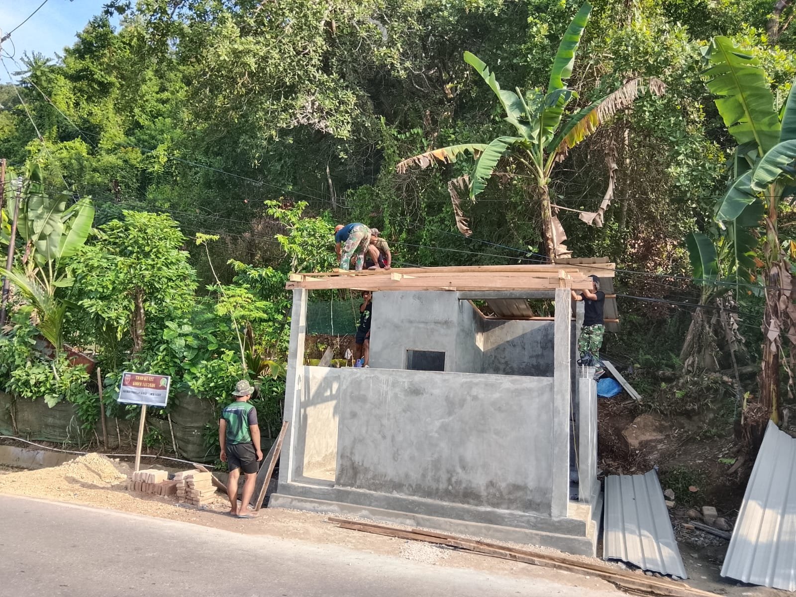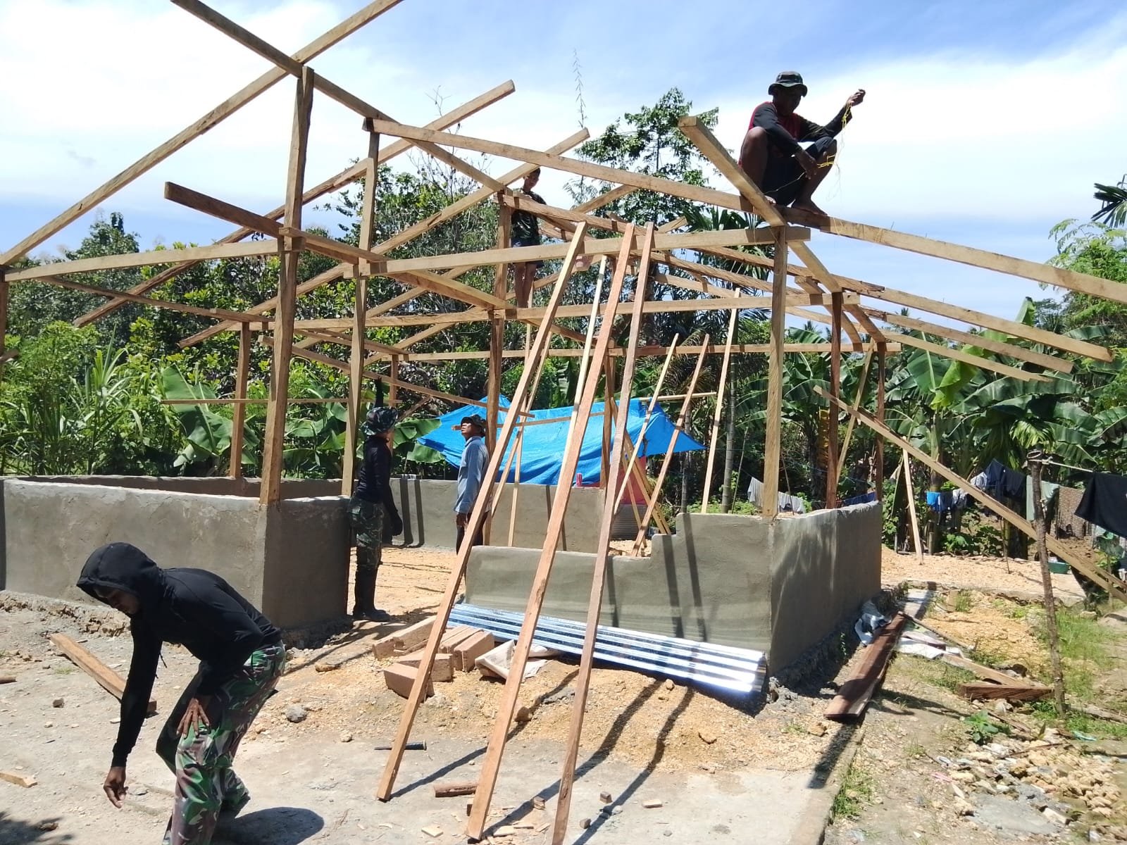 Kendari – Anggota Satgas TMMD ke-127 dari Kodim 1417/Kendari bersama masyarakat setempat mempercepat pembangunan fasilitas sanitasi dengan melakukan pemasangan atap