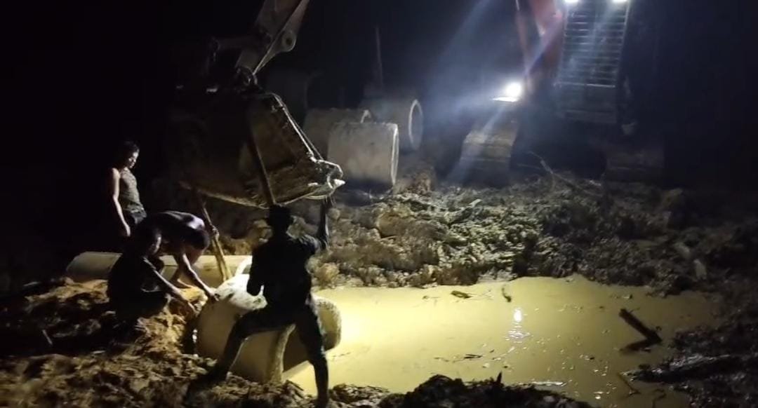 NAGAN RAYA – Suasana malam di lokasi pembangunan jalan Desa Ujong Blang menuju Desa Pante Ara, Kecamatan Beutong, masih dipenuhi