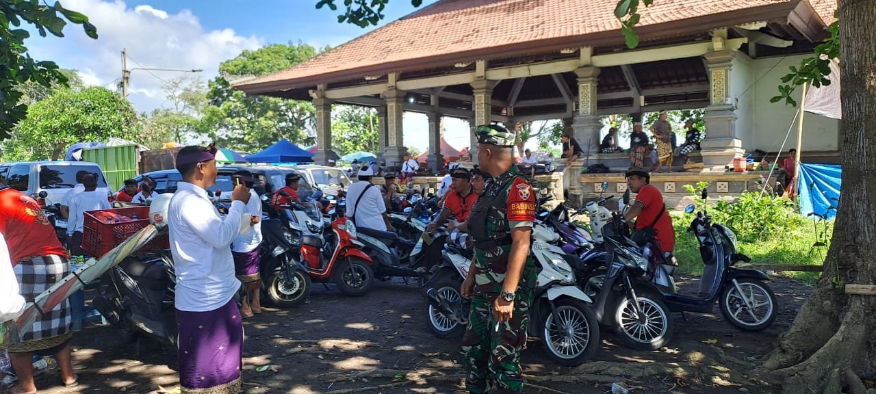 Ciptakan Kondusifitas, Babinsa Langgahan Bersama Warga Amankan Prosesi Melasti ke Pura Watu Kelotok Klungkung