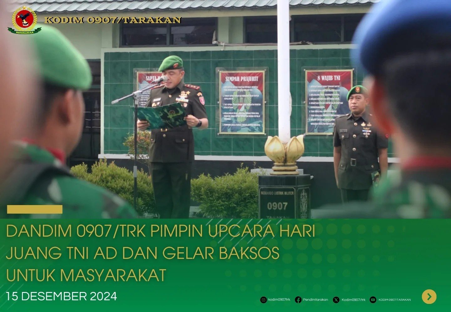 Tarakan – Komandan Distrik Militer (Dandim) 0907/Trk Letkol Kav Jhon B.C.Simarmata.M.Han. memimpin upacara memperingati Hari Juang TNI Angkatan Darat yang berlangsung khidmat di lapangan Makodim Jl.P.Kalimantan RT.17 Kel.Kampung 1 Skip,Kec.Tarakan Tengah, Minggu, (15/12/2024).