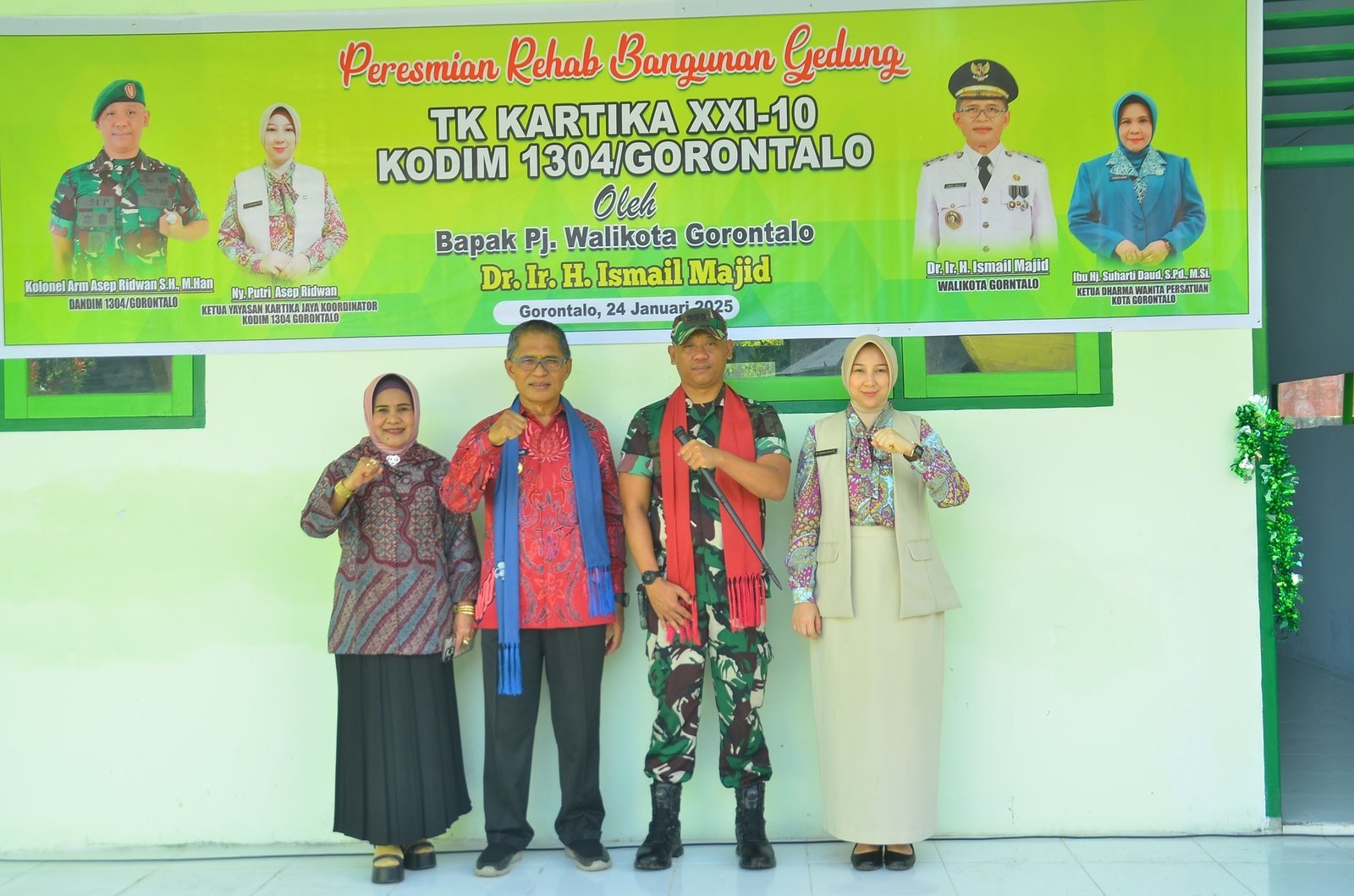 Gorontalo, 24 Januari 2024 – Komandan Kodim (Dandim) 1304/Gorontalo, Kolonel Arm Asep Ridwan, S.H., M.Han., bersama Penjabat (Pj) Wali Kota Gorontalo, Dr. Ir. H. Ismail Madjid, M.TP., secara resmi meresmikan rehabilitasi bangunan Gedung Taman Kanak-Kanak (TK) Kartika XXI-10 yang berlokasi di Kelurahan Libuo, Kecamatan Dungingi, Kota Gorontalo, pada Jumat (24/01/2024).