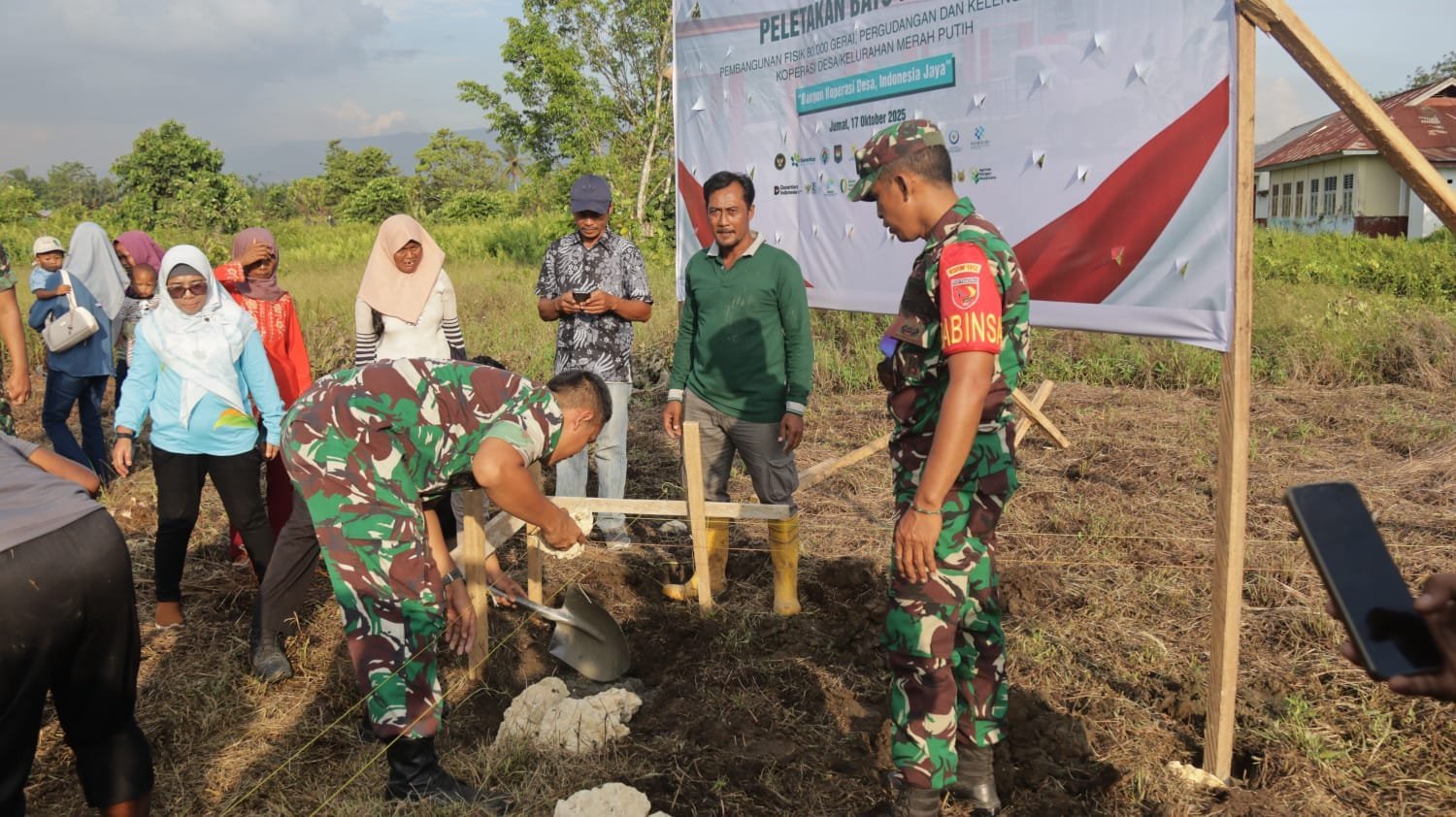 Halmahera Tengah-Komandan Kodim 1512/Weda, Letkol Inf Fachrozie Fanani, S.H, menghadiri kegiatan peletakan batu pertama pembangunan 800 Koperasi Merah Putih secara serentak di Kabupaten Halmahera Tengah, Jumat (17/10/2025).