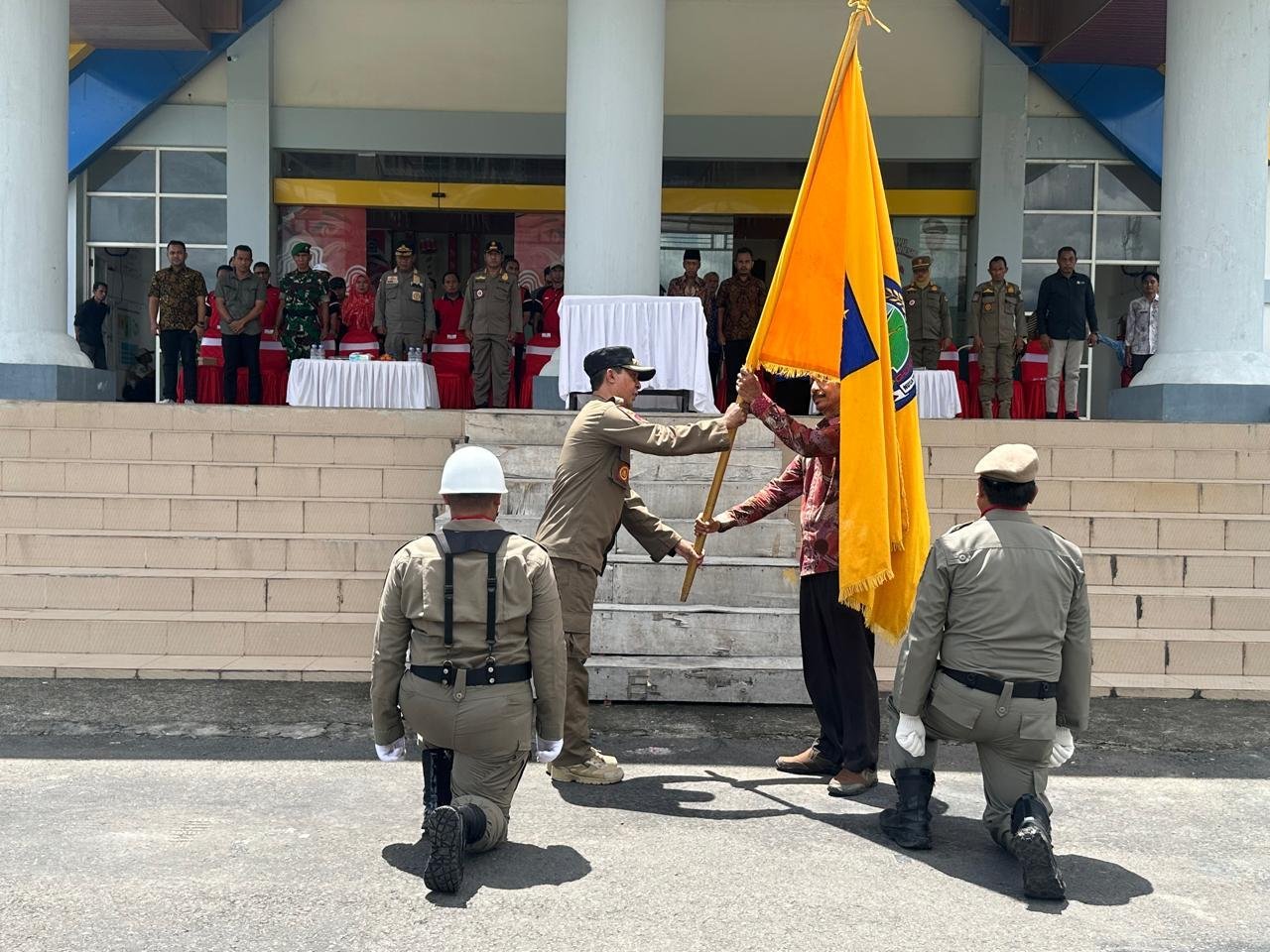 Usai penghormatan, Kasat Pol PP Kabupaten Bima menyerahkan Pataka Lambang NTB itu kepada Assisten Pemerintahan dan Kesra Sekretariat Daerah Kabupaten Dompu, H. Burhan, SH yang dilanjutkan dengan Penandatanganan berita acara serah terima.