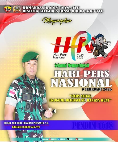 TTU – Dalam rangka merayakan Hari Pers Nasional (HPN) Tahun 2026, Komandan Kodim (Dandim) 1618/Timor Tengah Utara (TTU) memberikan ucapan selamat serta penghargaan kepada seluruh jurnalis yang telah berkontribusi dalam menyampaikan informasi kepada publik.