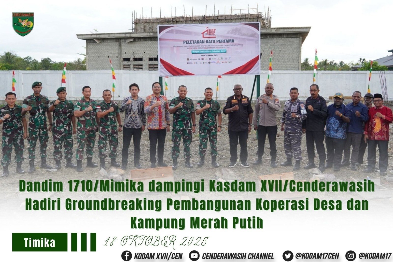 Timika ~ Bertempat di Kampung Limau Asri Timur, Sp.5, Distrik Iwaka,Kab. Mimika, Dandim 1710/Mimika (Letkol Inf M. Slamet Wijaya, S.Sos,.M.Han,.M.A) mendampingi Kasdam XVII/Cenderawasih (Brigjen TNI Thevi Angandowa Zebua) dalam kegiatan Gerakan Nasional groundbreaking Koperasi Merah Putih yang secara resmi dimulai serentak di seluruh Indonesia hari ini melalui video conference (vidcon) bersama Menteri Koperasi, Ferry Joko Juliantono, Jumat (17/10/2025).