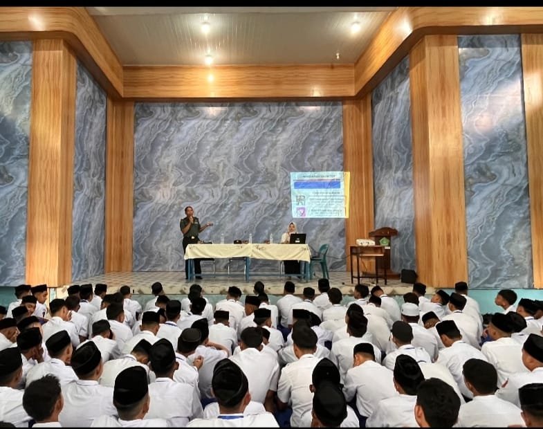 ACEH BARAT – Danramil 07/Johan Pahlawan, Kodim 0105/Aceh Barat, Kapten Inf Herinizal, S.Sos, memberikan materi wawasan kebangsaan kepada siswa-siswi baru di MAN 1 Meulaboh, Kamis (17/07/2025).