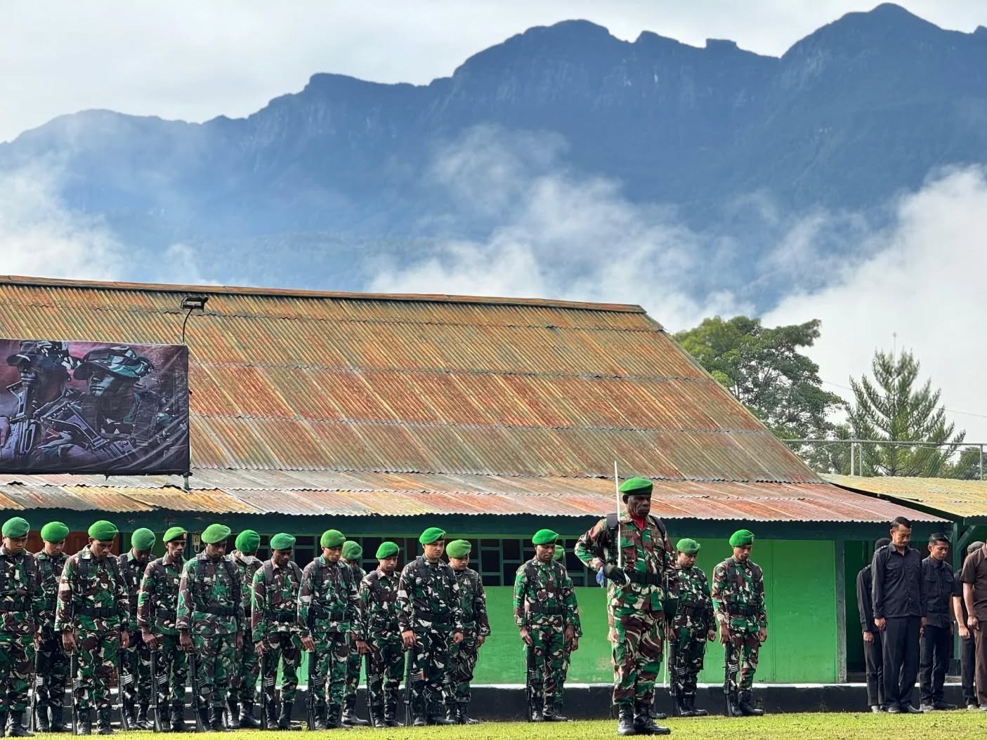 Wamena – Danramil 1702-01/Wamena, Mayor Inf Aprin Paembonan, memimpin Upacara Bendera rutin yang dilaksanakan setiap hari Senin di lapangan upacara Kodim 1702/Jayawijaya. Senin (20/01/2025).