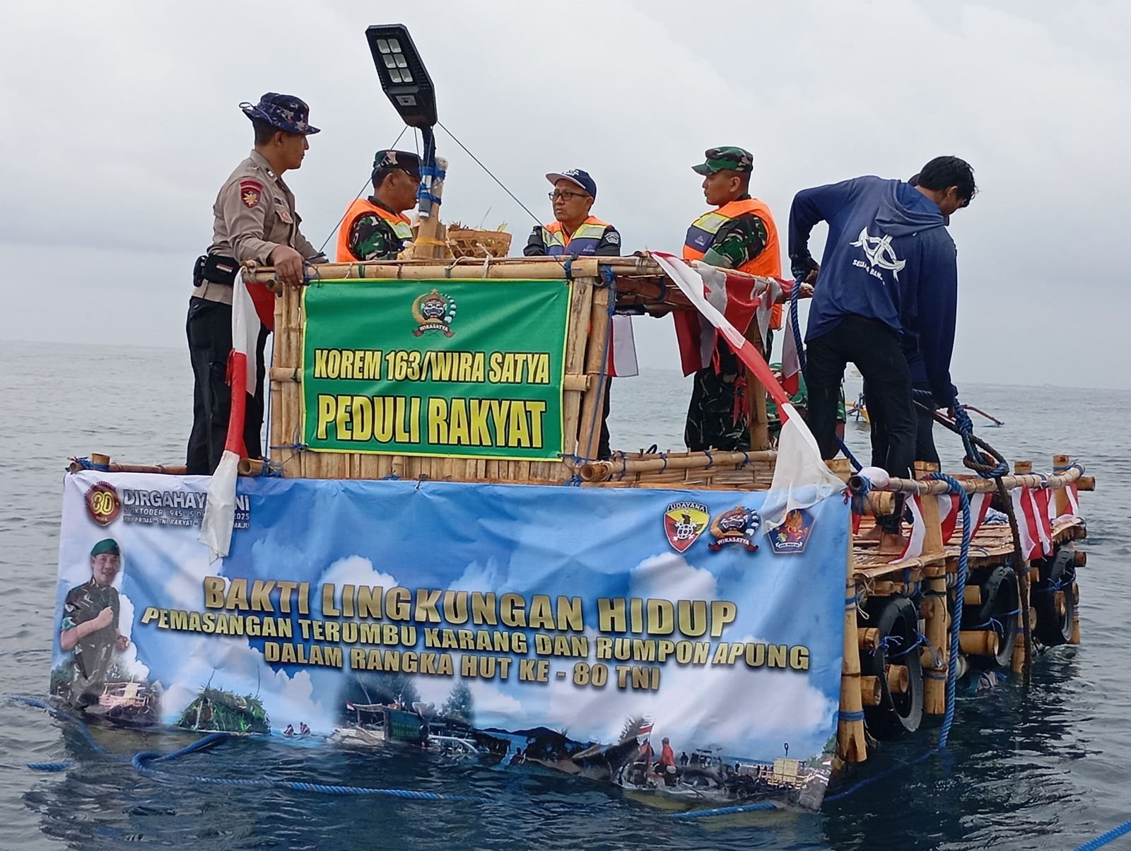 Buleleng – Peringatan Hari Ulang Tahun ke-80 TNI, Korem 163/Wirasatya bersama Kodim 1609/Buleleng menggelar pemasangan terumbu karang dan pelepasan rumpon apung di Pantai Banjar, Desa Banjar, Kabupaten Buleleng, Selasa (30/9/2025). Kegiatan ini juga disertai bakti sosial berupa pembagian sembako bagi masyarakat pesisir.