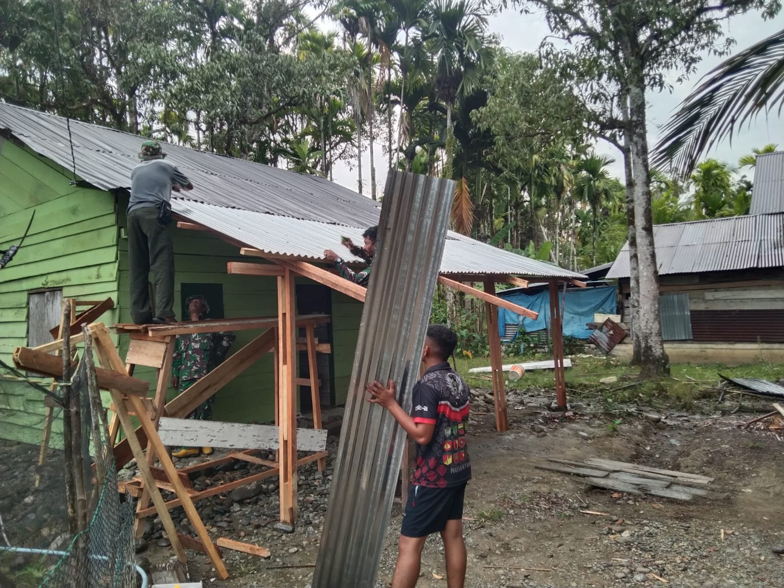 Perehaban ini bukan sekadar memperbaiki bangunan, tetapi juga memberi wajah baru pada hunian kayu milik warga. Dinding papan yang sebelumnya kusam kini diganti, lalu dilanjutkan dengan pengecatan agar rumah tampak lebih hidup dan bersih.