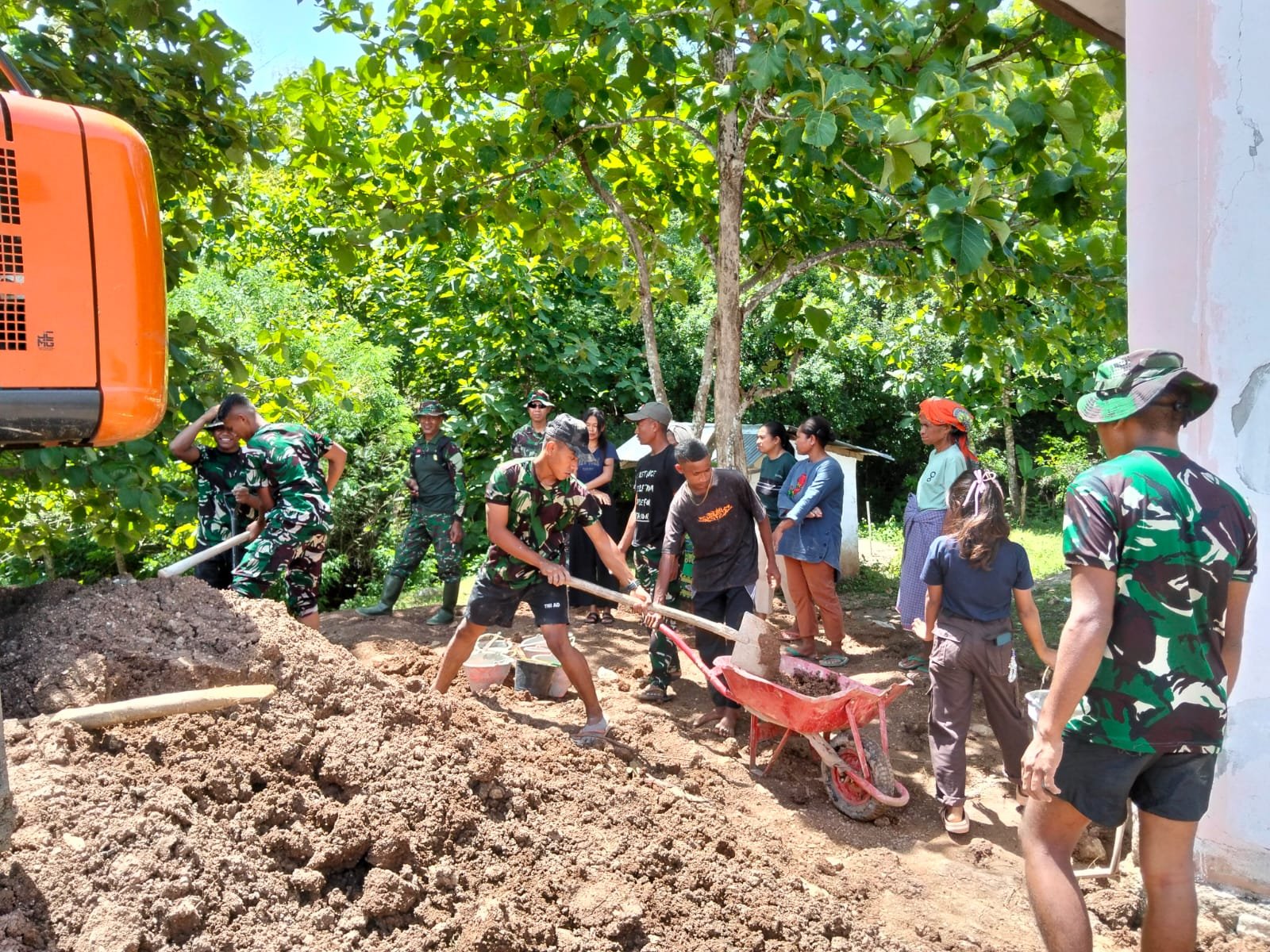Di bawah terik matahari, proses pengangkatan tanah dilakukan dengan menggunakan ember dan sekop, menggambarkan semangat dan dedikasi tinggi demi mencapai pendidikan yang lebih baik. Keringat yang bercucuran menjadi simbol nyata dari kerja keras dan keinginan untuk memajukan pendidikan di daerah perbatasan.