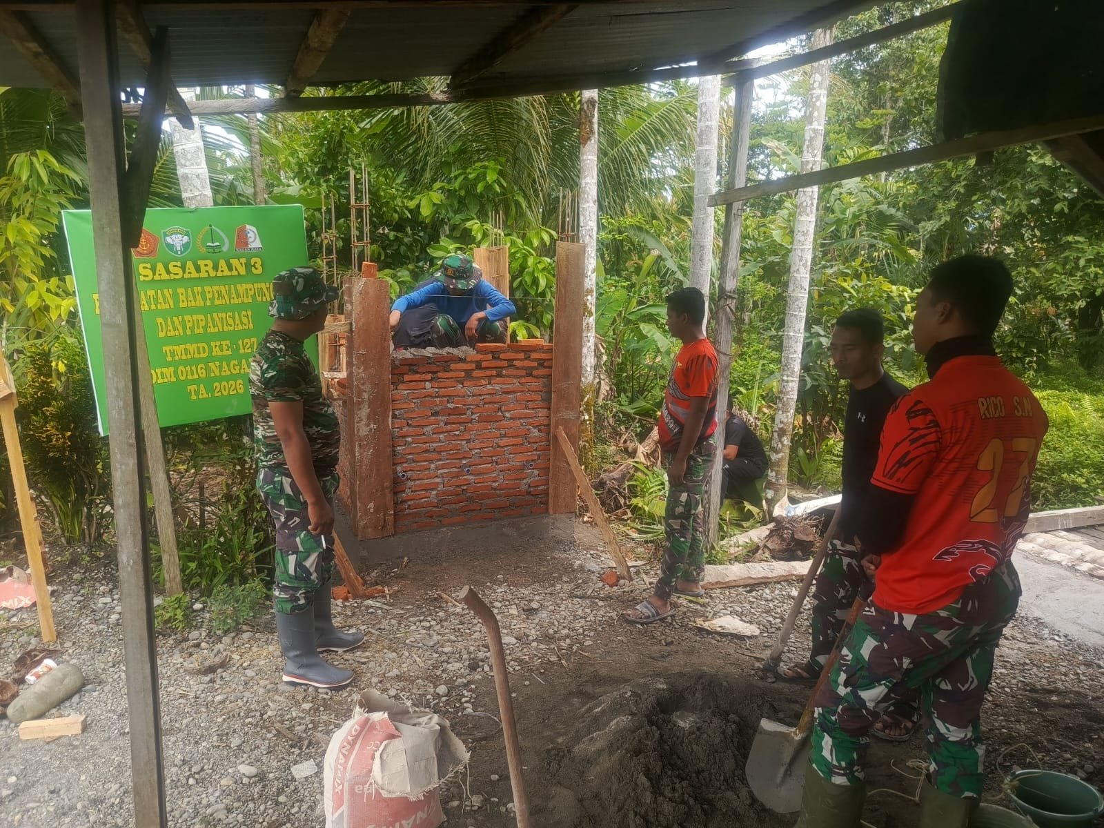 Di lokasi sasaran ketiga pembangunan, anggota Satgas tampak sibuk menyusun bata untuk memperkuat konstruksi tendon penampungan air. Pekerjaan dilakukan secara gotong royong dengan penuh dedikasi demi menghadirkan akses air bersih bagi masyarakat.