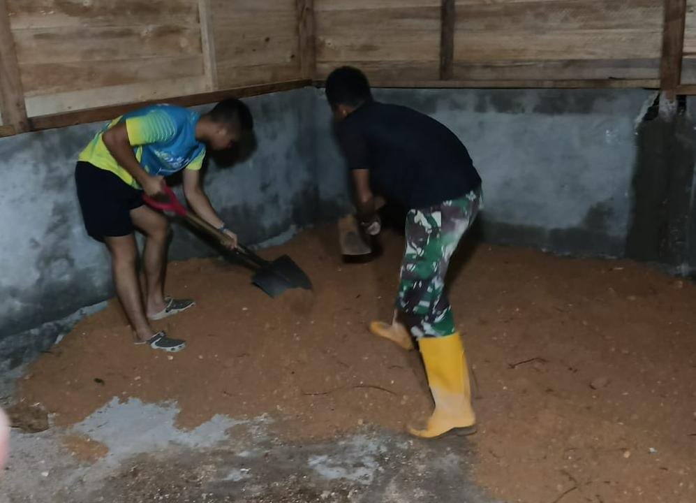 Dengan hanya mengandalkan penerangan lampu seadanya, para prajurit TNI berkolaborasi dengan masyarakat setempat terus bekerja untuk menyelesaikan pembangunan, terutama pada bagian dinding dan atap, agar rumah tersebut segera dapat dihuni oleh para penerima manfaat.