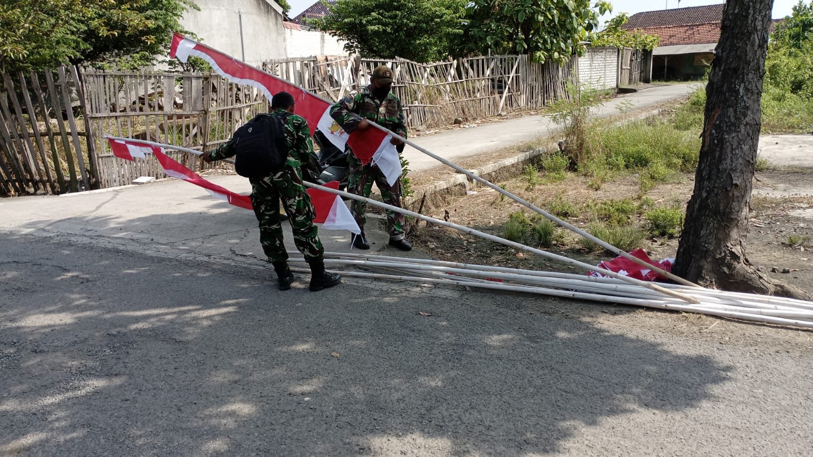 Suasana pagi hari itu dipenuhi dengan kebersamaan, di mana warga saling bercanda dan bekerja sama, tanpa ada perbedaan antara masyarakat sipil dan personel berseragam. Mereka bahu-membahu dalam mengangkut tiang bendera, mengikat tali, dan memastikan setiap bendera berdiri dengan tegak.