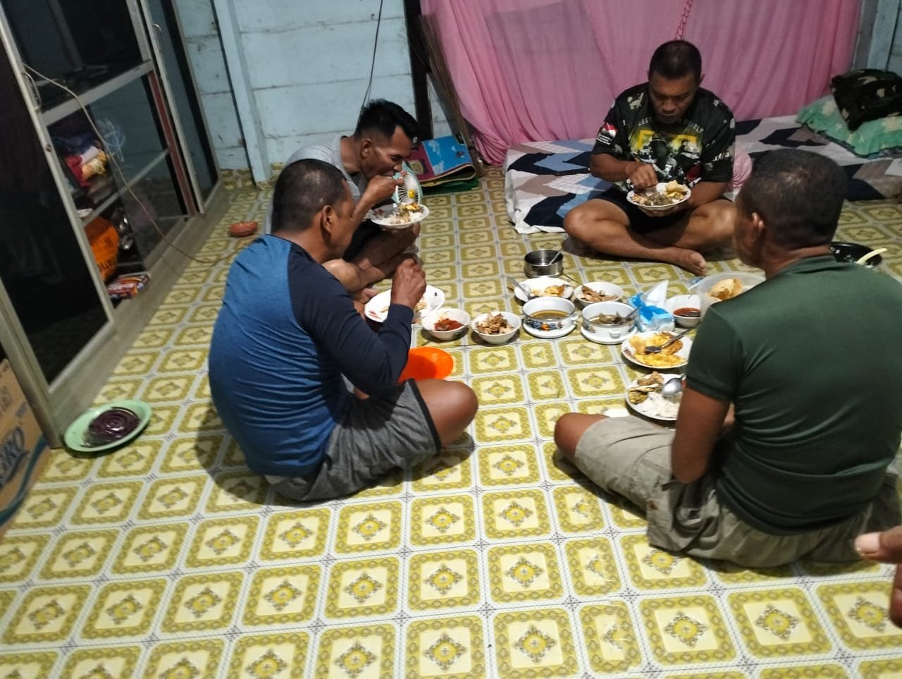 “Beginilah kondisi makan malam kami, meski menu yang disuguhkan ala kadarnya, tapi rasa kebersamaan semakin akrab serasa makan bersama keluarga sendiri,” imbuhnya.