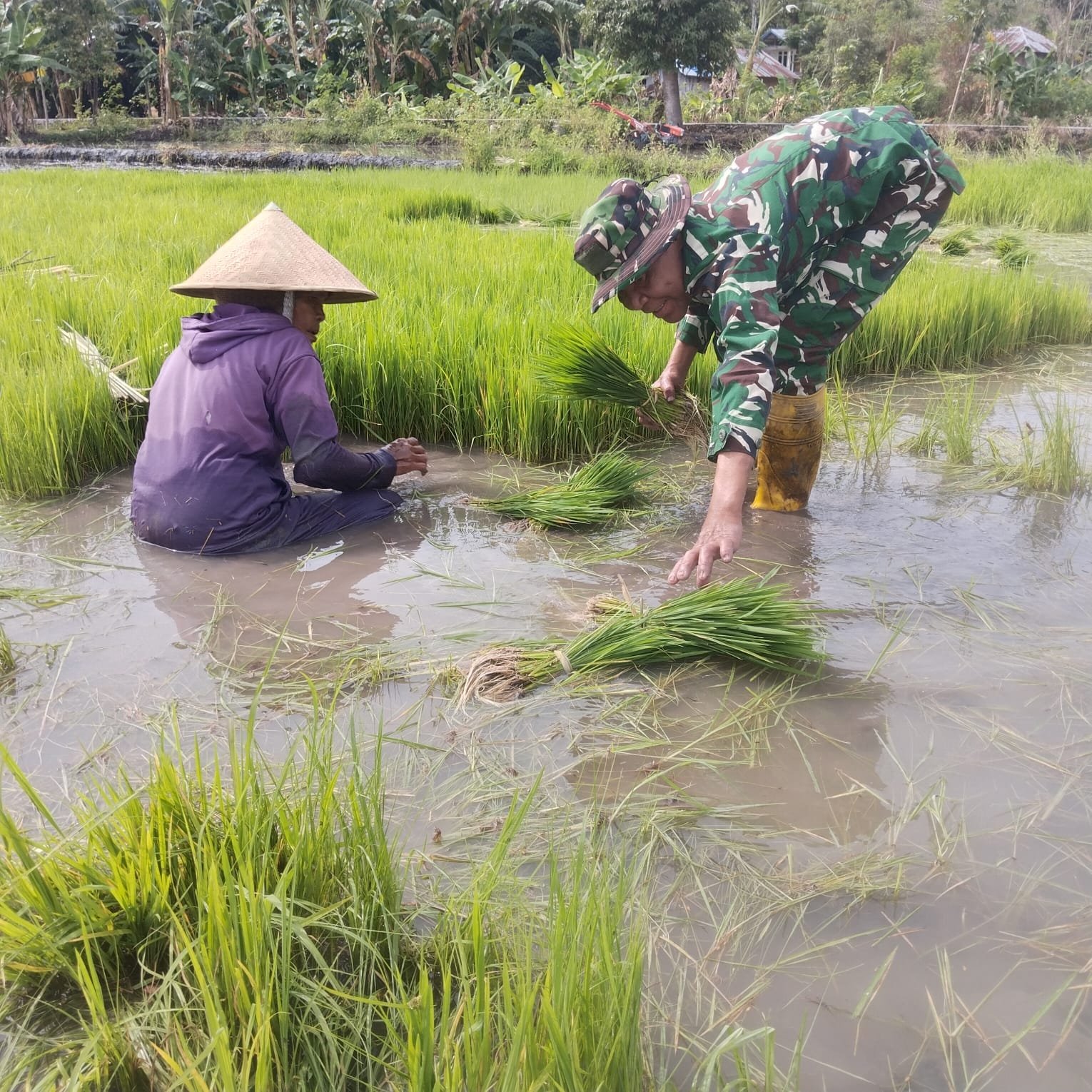 Di bawah terik matahari, kehadiran Sertu Muhamad Ali memberikan semangat baru bagi para petani. Ia bukan hanya memantau, tetapi juga berpartisipasi aktif dalam kegiatan pencabutan bibit padi yang siap untuk ditanam dan membersihkan rumput liar (gulma) yang dapat mengganggu pertumbuhan tanaman.