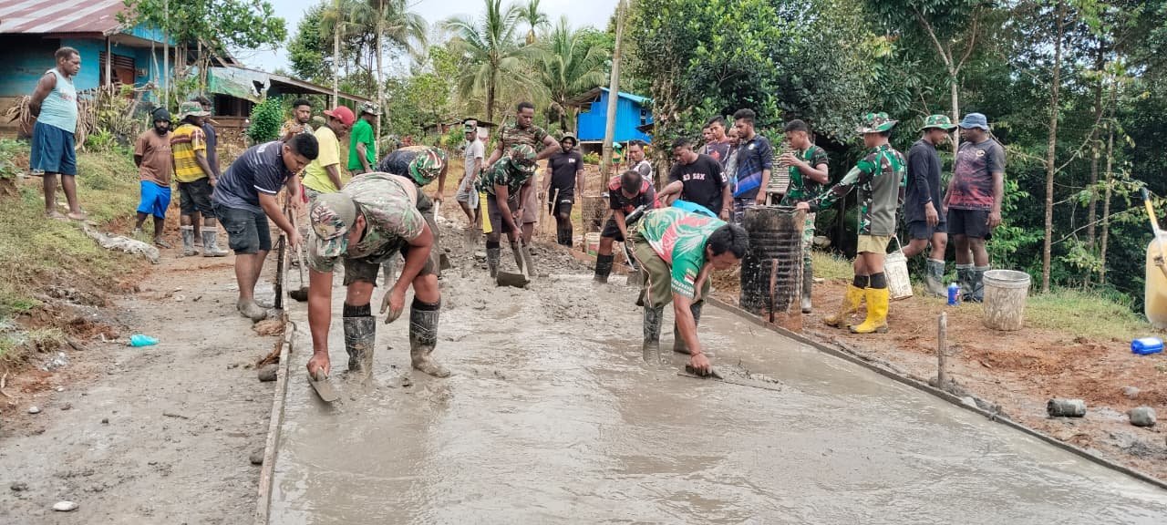 Meski bekerja di bawah terik matahari, semangat para prajurit dan warga tidak surut. Mereka bersama-sama menyiapkan adukan semen, mengangkut material, dan meratakan permukaan jalan dengan penuh antusias.