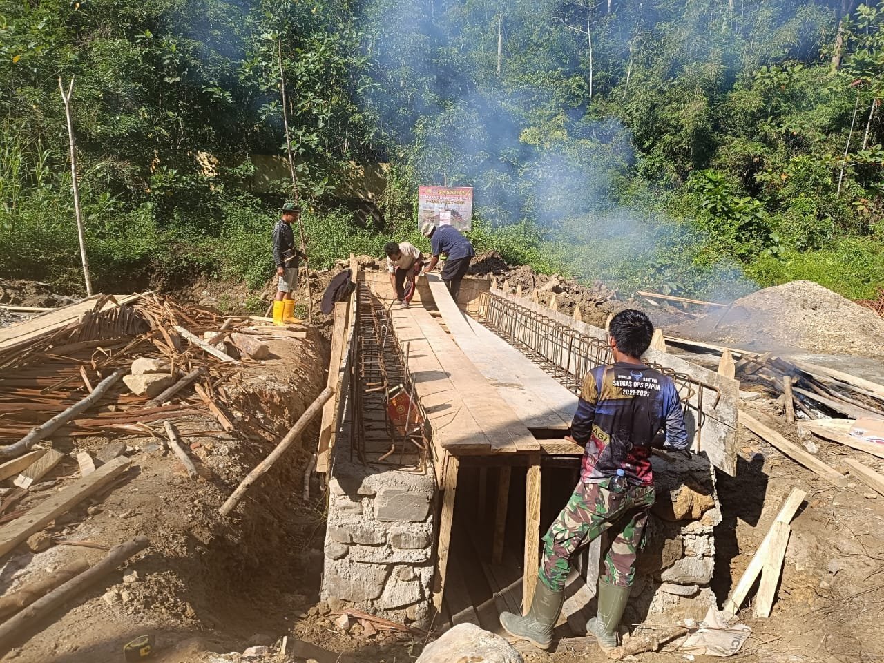 Suasana gotong royong tampak kental ketika prajurit dan masyarakat bekerja bahu-membahu menata dan mengikat besi tulangan sesuai ukuran. Kekompakan dan kebersamaan tersebut mencerminkan semangat kemanunggalan TNI dan rakyat yang menjadi roh pelaksanaan TMMD.