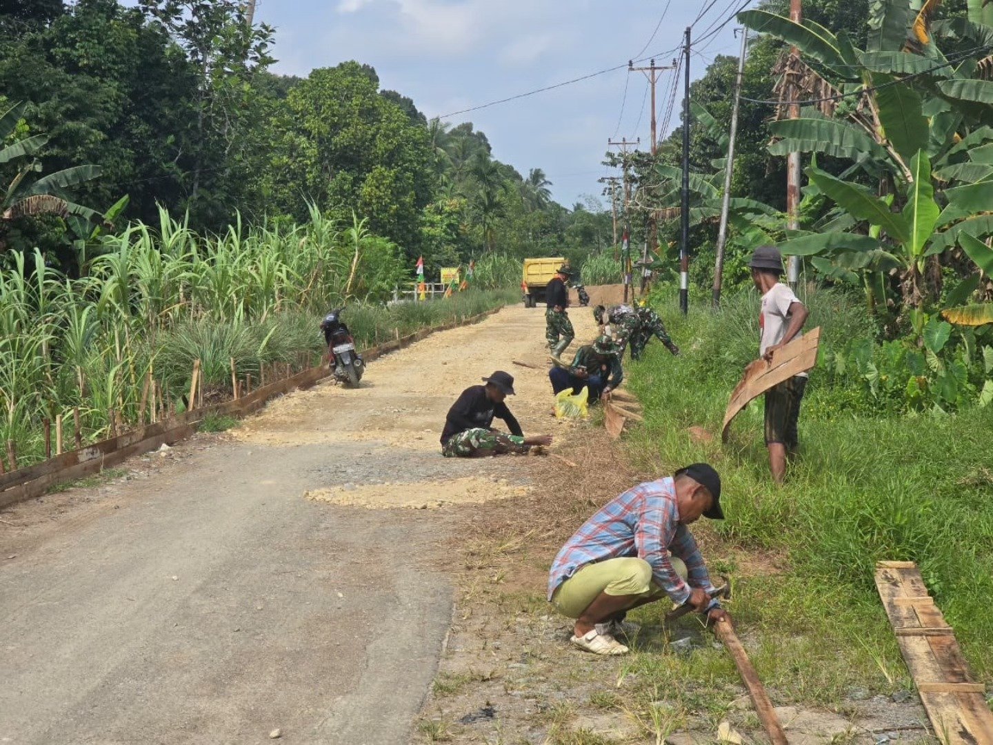 Pekerjaan ini merupakan tahap penting dalam proses pengecoran jalan yang nantinya akan meningkatkan aksesibilitas dan memperlancar mobilitas warga. Dengan semangat gotong royong yang tinggi, personel TNI bersama masyarakat tampak kompak bahu membahu menyelesaikan setiap tahapan pekerjaan.