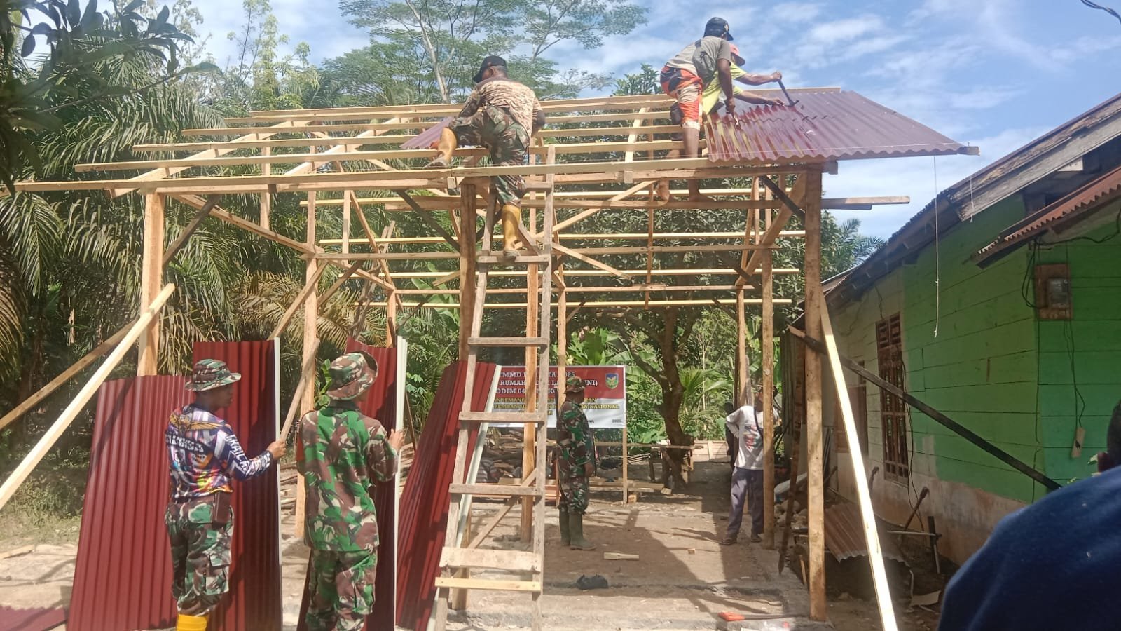 Satgas TMMD dan warga tampak kompak di lapangan. Mereka saling membantu mengangkat material, memotong lisplang sesuai ukuran, dan memastikan pemasangan berjalan rapi dan kuat. Cuaca yang cerah menjadi faktor pendukung lancarnya pekerjaan di hari keenam ini.