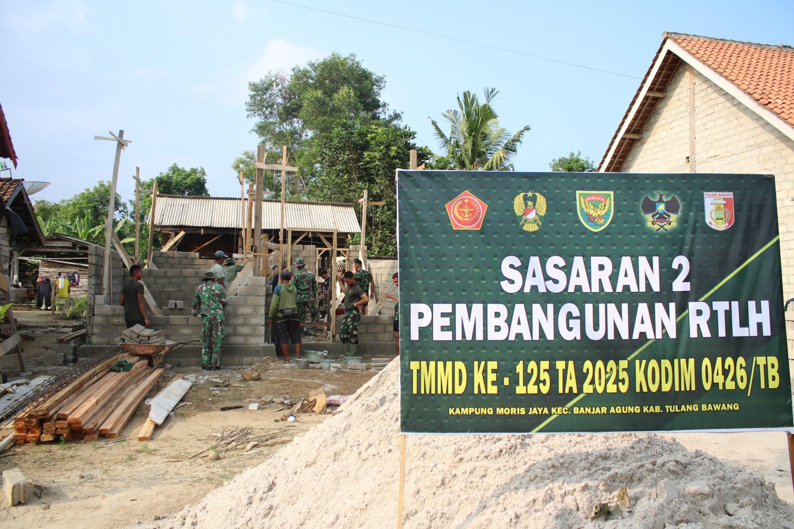 Pembangunan Rumah Tidak Layak Huni (RTLH) sasaran 2 dalam program TMMD ke-125 Kodim 0426/Tulang Bawang menunjukkan perkembangan pesat. Hingga hari ke-8 pelaksanaan, Rabu (30/07/2025), progres pembangunan yang berlokasi di Kampung Moris Jaya, Kecamatan Banjar Agung, telah mencapai tahapan penting.