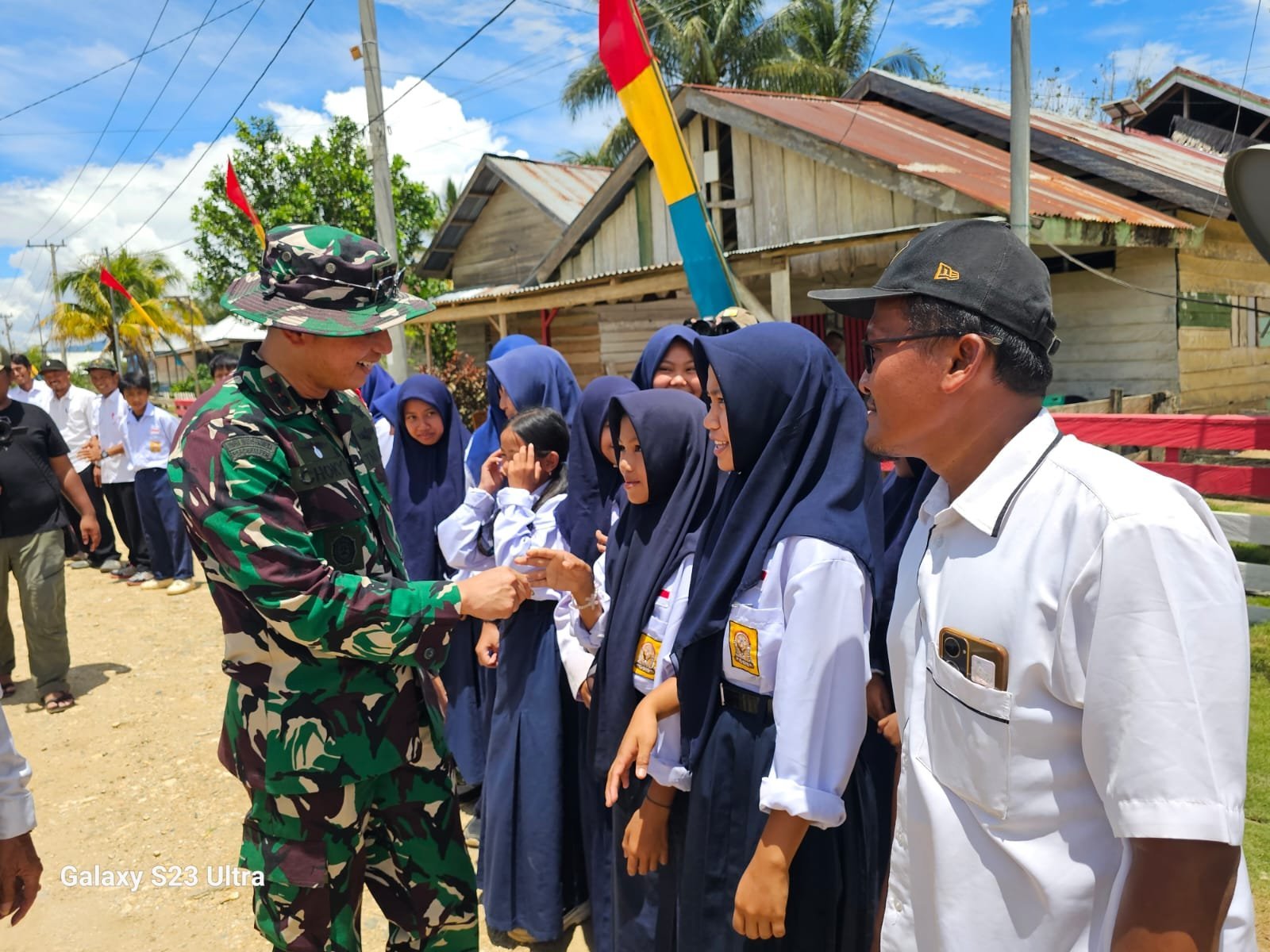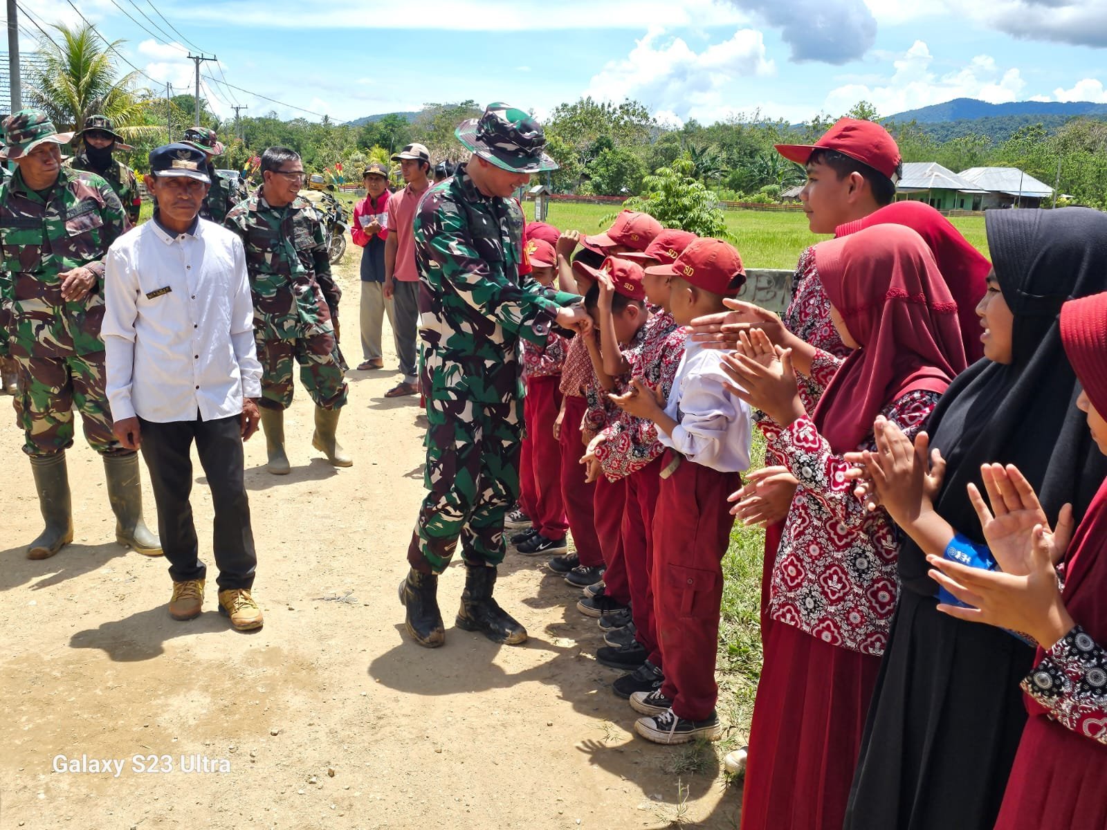 Kedatangan Komandan Satgas TMMD 126 Letkol Inf Choky Gunawan Disambut Meriah oleh Anak-Anak Sekolah di Desa Tanggauna