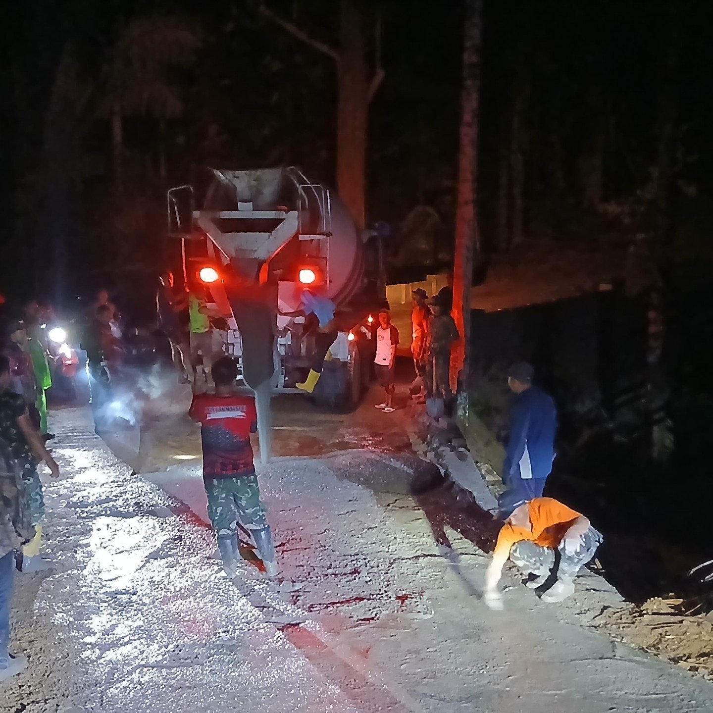 Hujan Deras Tak Surutkan Semangat Satgas TMMD 126 dan Warga Giri Madia Lembur Cor Jalan Hingga Malam