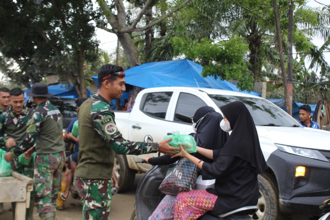Kegiatan tersebut dilaksanakan dengan membagikan kebutuhan pokok kepada masyarakat yang terdampak banjir sebagai bentuk perhatian dan kepedulian TNI terhadap kesulitan yang dialami warga.