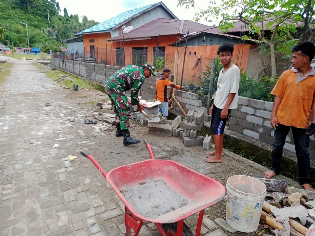 Jalin Keakraban, Babinsa Koramil 04 Dondo Bantu Warga Memasang Batako Pagar Rumah