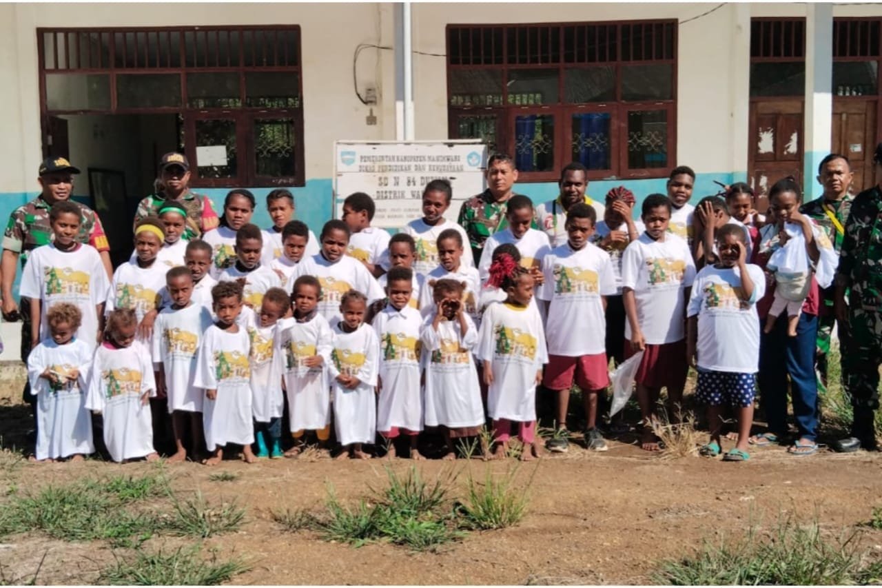 Dalam rangka menyambut perayaan Natal, Danramil 1801-02/Warmare Kapten Inf Prapto Widodo bersama Babinsa melaksanakan kegiatan pembagian bingkisan berupa kaos Natal dari Kasad kepada para siswa SD Negeri 84 Kampung Duwin, Distrik Warmare, Kabupaten Manokwari, Provinsi Papua Barat, Kamis (12/12/2024)