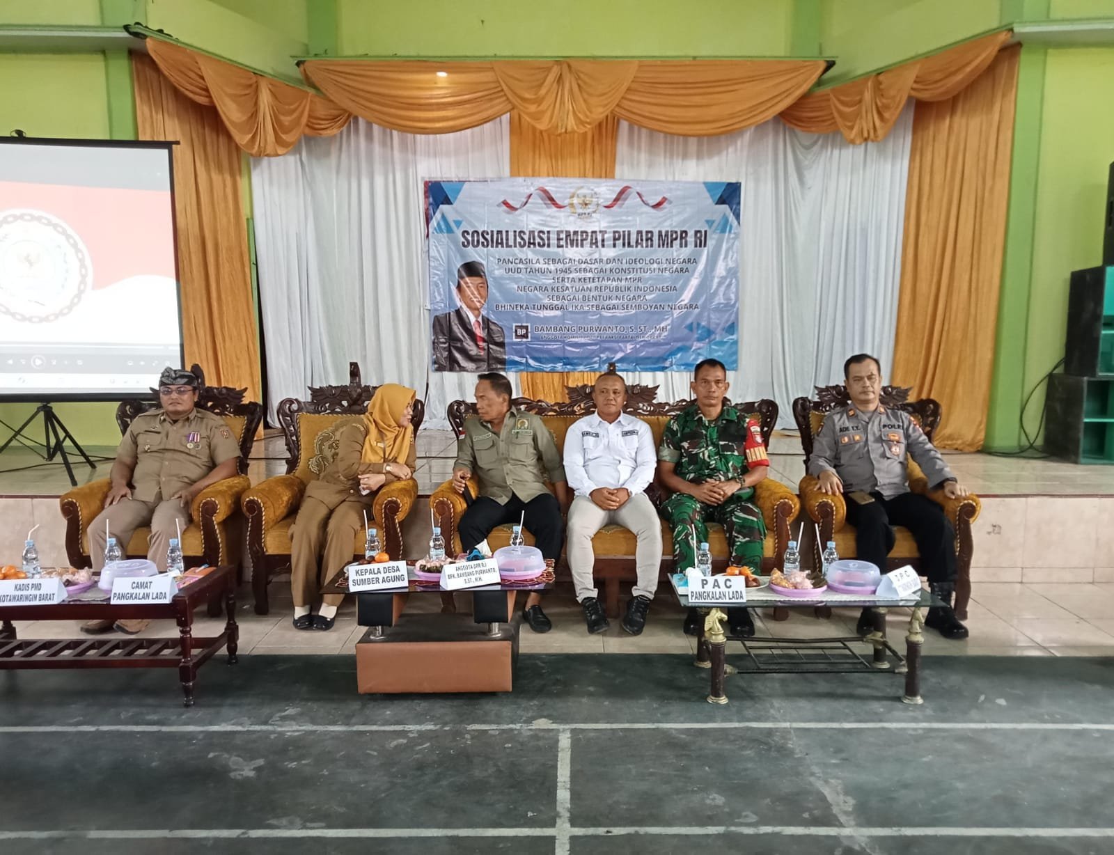 Kotawaringin Barat — Dalam upaya memperkuat semangat kebangsaan dan nilai-nilai dasar negara di tengah masyarakat, Danramil 1014-05/Pangkalan Banteng Kapten Inf Suwaryo menghadiri sekaligus menjadi narasumber dalam kegiatan Sosialisasi Empat Pilar Kebangsaan yang digelar di Aula Sumber Agung, Jl. A. Yani KM 23, Desa Sumber Agung, Kecamatan Pangkalan Lada, Senin pagi (20/10).