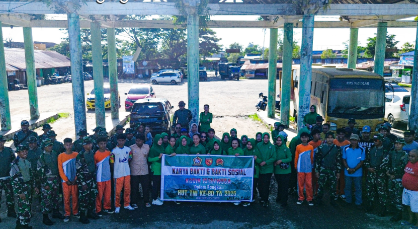 Halmahera Tengah-Dalam rangka memperingati Hari Ulang Tahun (HUT) ke-80 Tentara Nasional Indonesia (TNI), Pada Pukul 08.00 Wit Kodim 1512/Weda menggelar kegiatan Karya Bakti TER PRIMA berupa pembersihan fasilitas umum Terminal Kota Weda. Kegiatan ini berlangsung di Desa Fidy Jaya, Kecamatan Weda Kabupaten Halmahera Tengah Provinsi Maluku Utara, pada Jumat, (26/09/2025), dengan melibatkan sekitar 50 orang prajurit TNI beserta Persit KCK Cabang XL bersama masyarakat setempat.