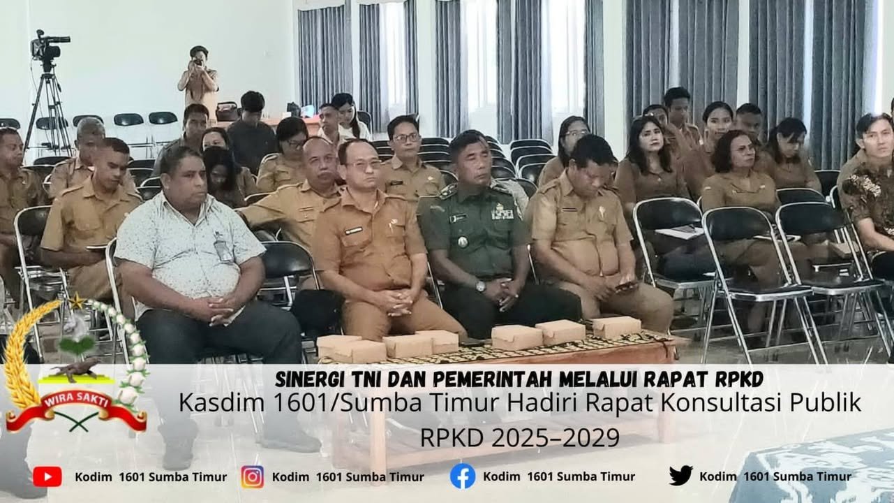 NTT – Sumba Timur. Mewakili Komandan Kodim 1601/Sumba Timur, Kepala Staf Kodim Mayor Inf Sambudi menghadiri Rapat Konsultasi Publik Dokumen Rencana Penanggulangan Kemiskinan Daerah (RPKD) Kabupaten Sumba Timur Tahun 2025–2029. Kegiatan ini berlangsung di Aula Patola Ratu, Sekretariat Daerah Kabupaten Sumba Timur, Jalan Jenderal Soeharto, Kelurahan Hambala, Kecamatan Kota Waingapu, Selasa (25/11/2025).