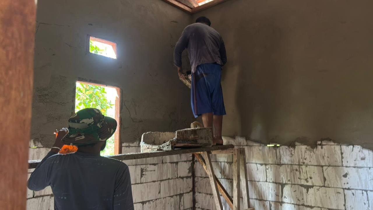 Tahap pemasangan plester ini merupakan langkah krusial dalam penyempurnaan pembangunan rumah, karena dapat meningkatkan kualitas bangunan yang dihasilkan. Kerja sama antara personel Satgas dan warga terlihat jelas saat mereka berupaya bersama-sama memastikan hasil pekerjaan mencapai standar yang diharapkan.