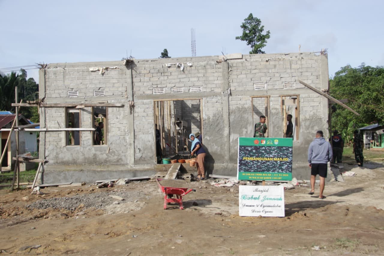 Tolitoli – Pembangunan masjid di Dusun Ogomolobu, Desa Oyom, Kecamatan Lampasio, Kabupaten Tolitoli, dipenuhi semangat gotong royong dalam kegiatan TNI Manunggal Membangun Desa (TMMD) ke-127 pada Senin (23/2/2026). Anggota Satgas TMMD dari Kodim 1305/BT terlihat bekerja sama dengan masyarakat setempat dalam proses pembangunan, mulai dari pengangkutan material hingga pengerjaan struktur bangunan dilakukan secara kolektif.