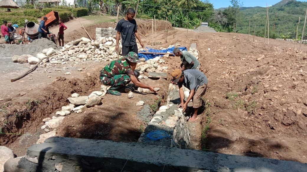Kegiatan Pra TMMD dimulai dengan pengerjaan pondasi bangunan, di mana terlihat jelas peran aktif antara Babinsa dan masyarakat setempat. Serka Lamberto Da Costa, salah satu anggota Koramil, langsung terjun ke lokasi, berkolaborasi dengan warga setempat dalam semangat gotong royong yang tinggi.