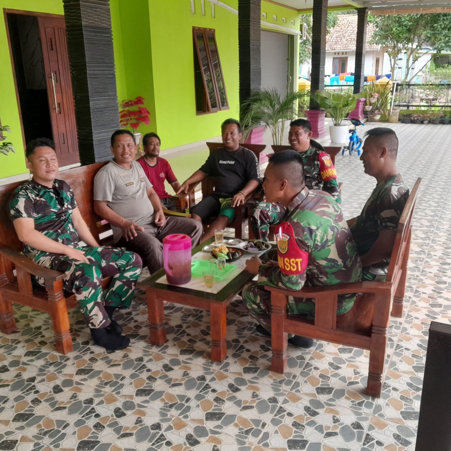 Dalam suasana yang hangat, anggota Satgas dan warga saling berbincang tentang beragam topik, mulai dari kondisi desa, kemajuan program TMMD, hingga kehidupan sehari-hari warga. Suasana kebersamaan dan kekeluargaan sangat terasa dalam interaksi tersebut.