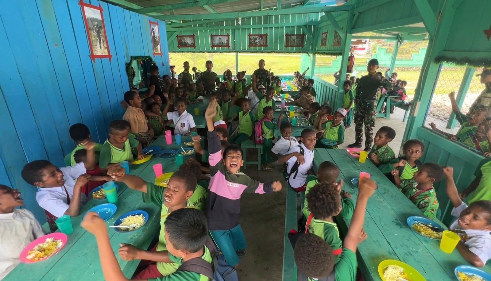 Oksibil, Pegunungan Bintang — Pos Komando Taktis (Kotis) Satgas Pamtas RI–PNG Yonif 751/Vira Jaya Sakti (VJS) menggelar acara kali ini dengan mengundang siswa-siswi SD setelah mereka pulang sekolah untuk mengikuti kegiatan makan bersama di Rumah Makan Swasembada. Kegiatan yang berlangsung pada hari Sabtu, 7 Februari 2026 ini merupakan bagian dari pembinaan teritorial yang bersifat edukatif dan humanis, dengan menggabungkan metode belajar yang menarik, permainan, dan kebersamaan.