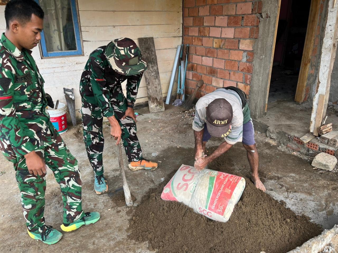 Saat ini, fokus pekerjaan tengah berada pada tahap plester dinding yang bertujuan untuk memperkuat struktur bangunan sekaligus memperindah tampilan rumah. Terlihat sinergi yang baik antara anggota Satgas dan masyarakat dalam pengadukan adonan semen serta pelapisan dinding yang dilakukan secara bertahap dengan cermat.