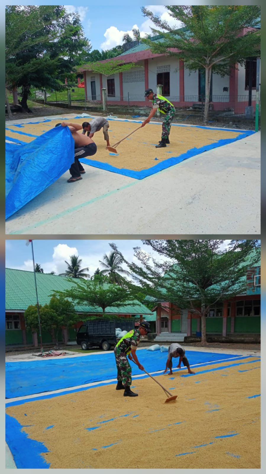 ACEH BARAT – Babinsa Koramil 02/Woyla Kodim 0105/Abar, Sertu M. Dahlan, membantu petani yang sedang menjemur padi usai dipanen beberapa waktu lalu dan ikut bersama warga (petani) menjemur padi di Desa Pasi Aceh, Kecamatan Woyla, Kabupaten Aceh Barat, Minggu (05/04/2026).