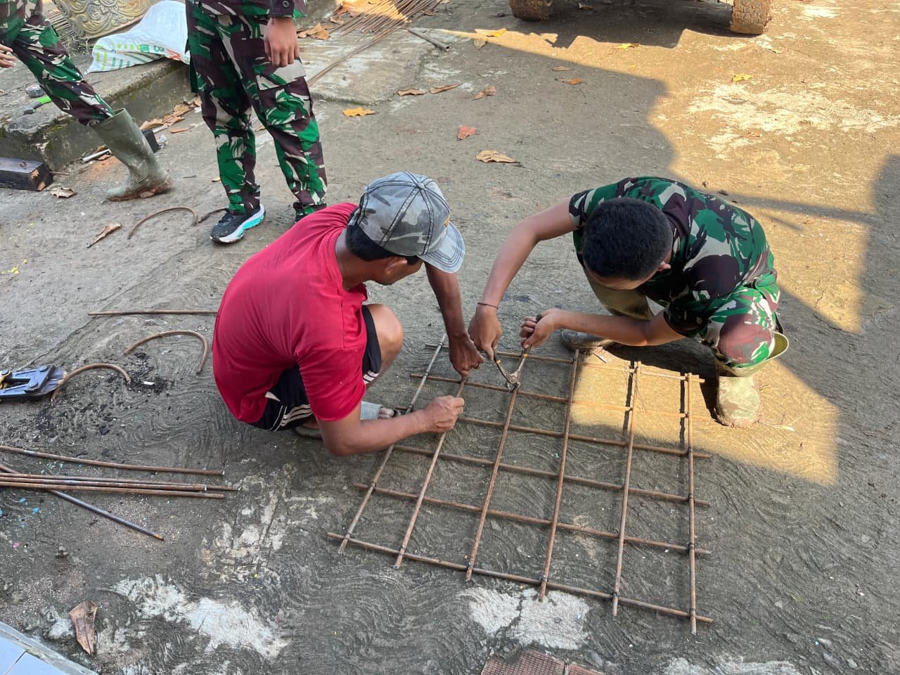 Proses pembangunan berjalan dengan melibatkan partisipasi aktif dari anggota Satgas TMMD serta masyarakat. Kegiatan ini mencakup pengangkutan material bangunan, pemasangan batako, hingga perakitan struktur bangunan, yang semuanya dilakukan dengan semangat kebersamaan.